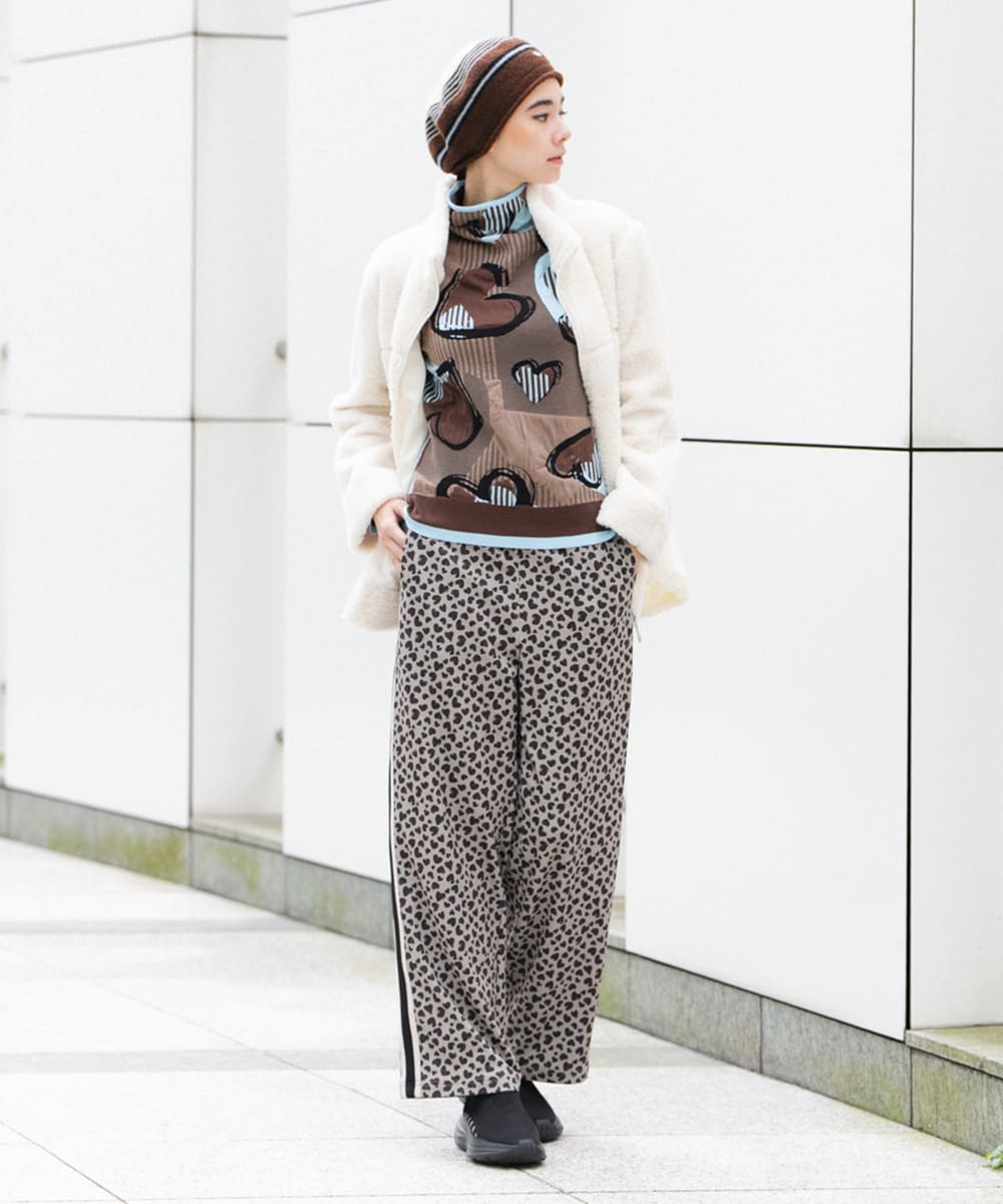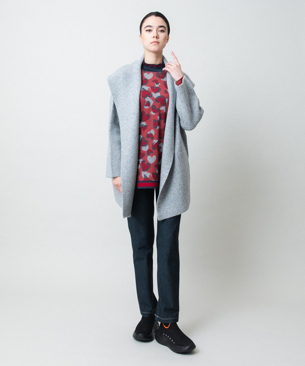 ニュアンス豊かなイラストタッチのハート柄をジャカードで編み立てた、存在感のあるデザインニット。