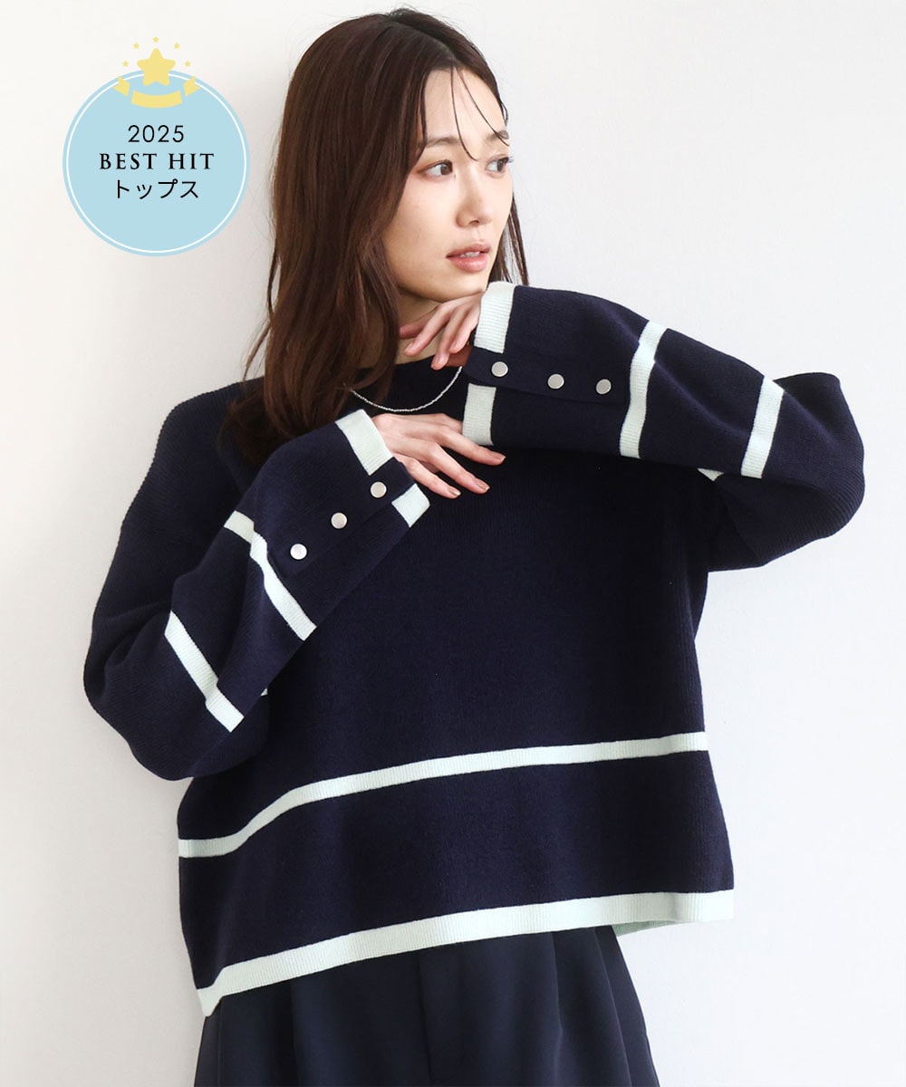 袖や裾の配色ラインがポイントのニットは、ボクシーなシルエットでインせずにも素敵に決まる着丈に。人気のデザインは、冬から春に向けても着回しやすい新色3色を加え、計6色と、きっとお気に入りのカラーが見つかるはず。