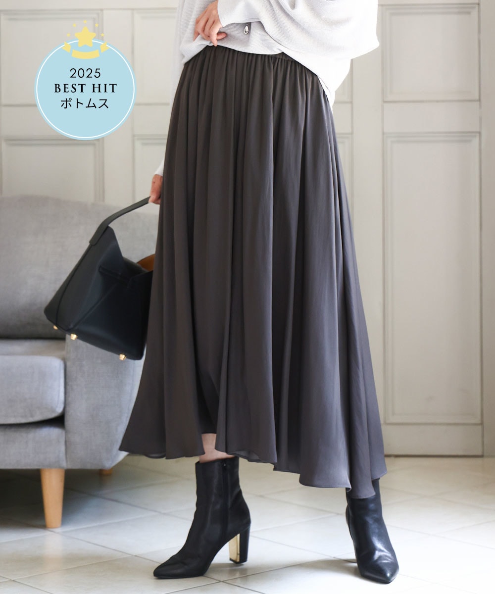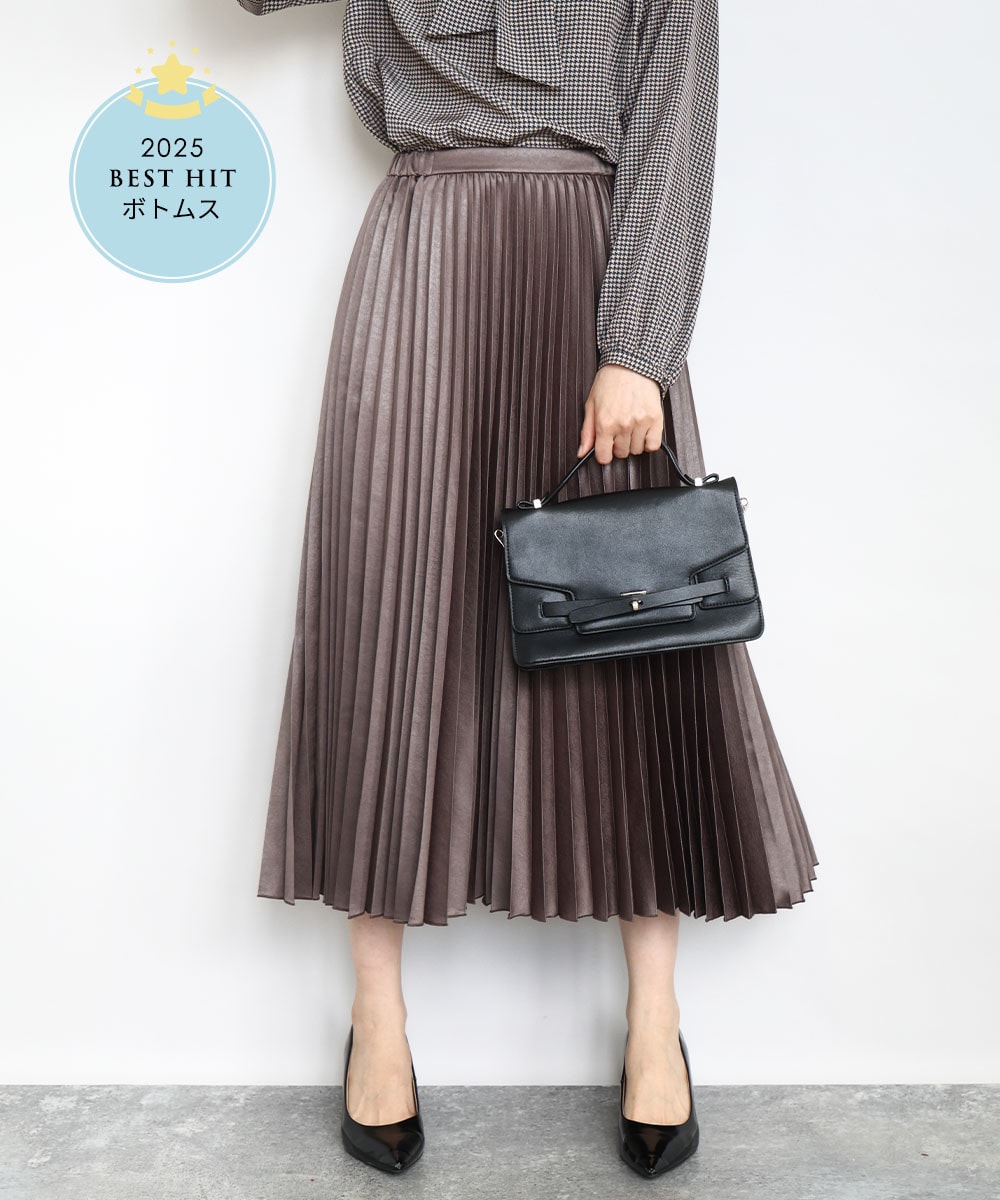 きれいな光沢感のあるレザーライクなやわらかなプリーツスカートは、カジュアルにもきれいにも着回せる優秀アイテム。きちんと見えながらも、ウエスト後ろはゴム仕様でストレスフリーな着心地も嬉しい。