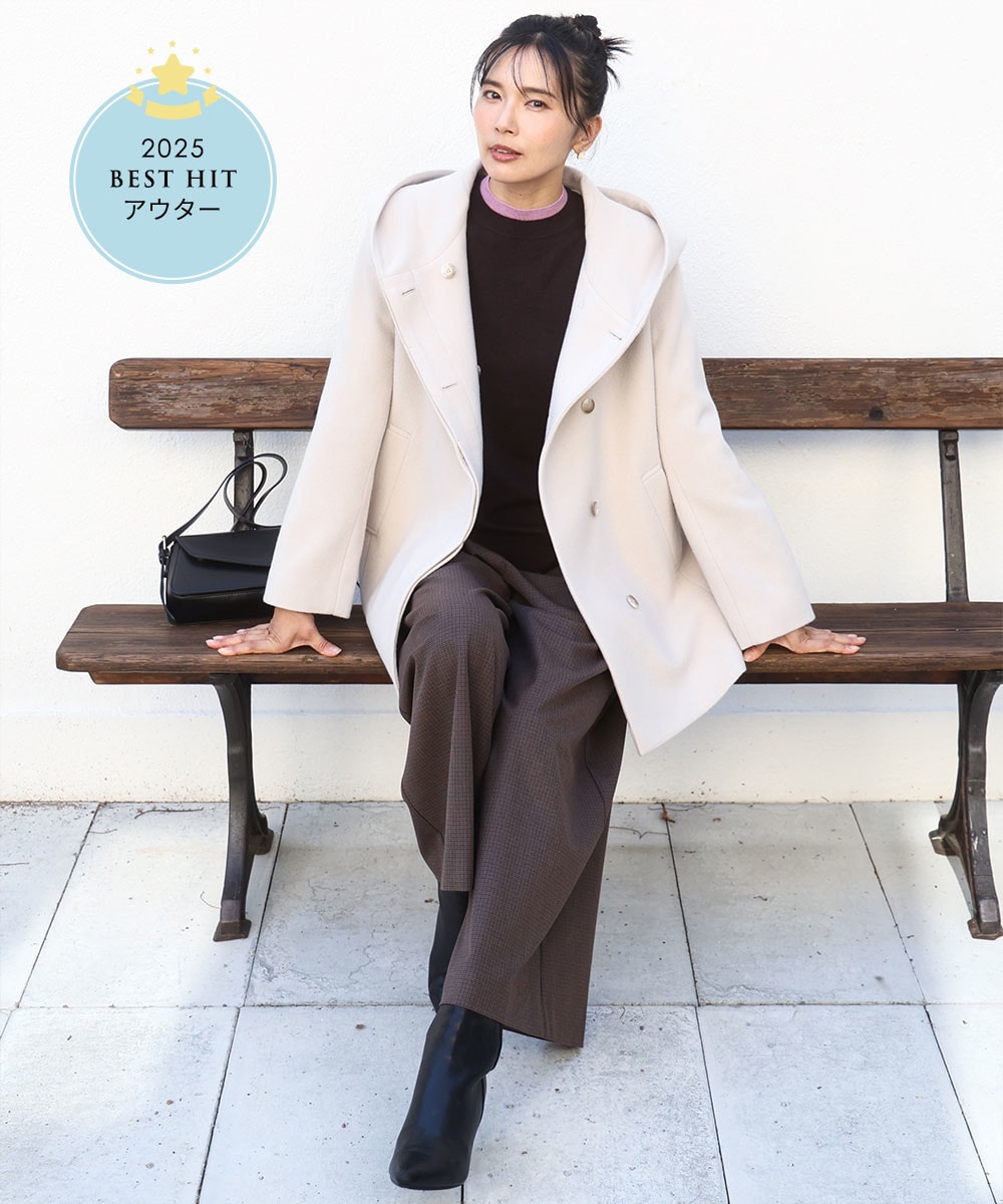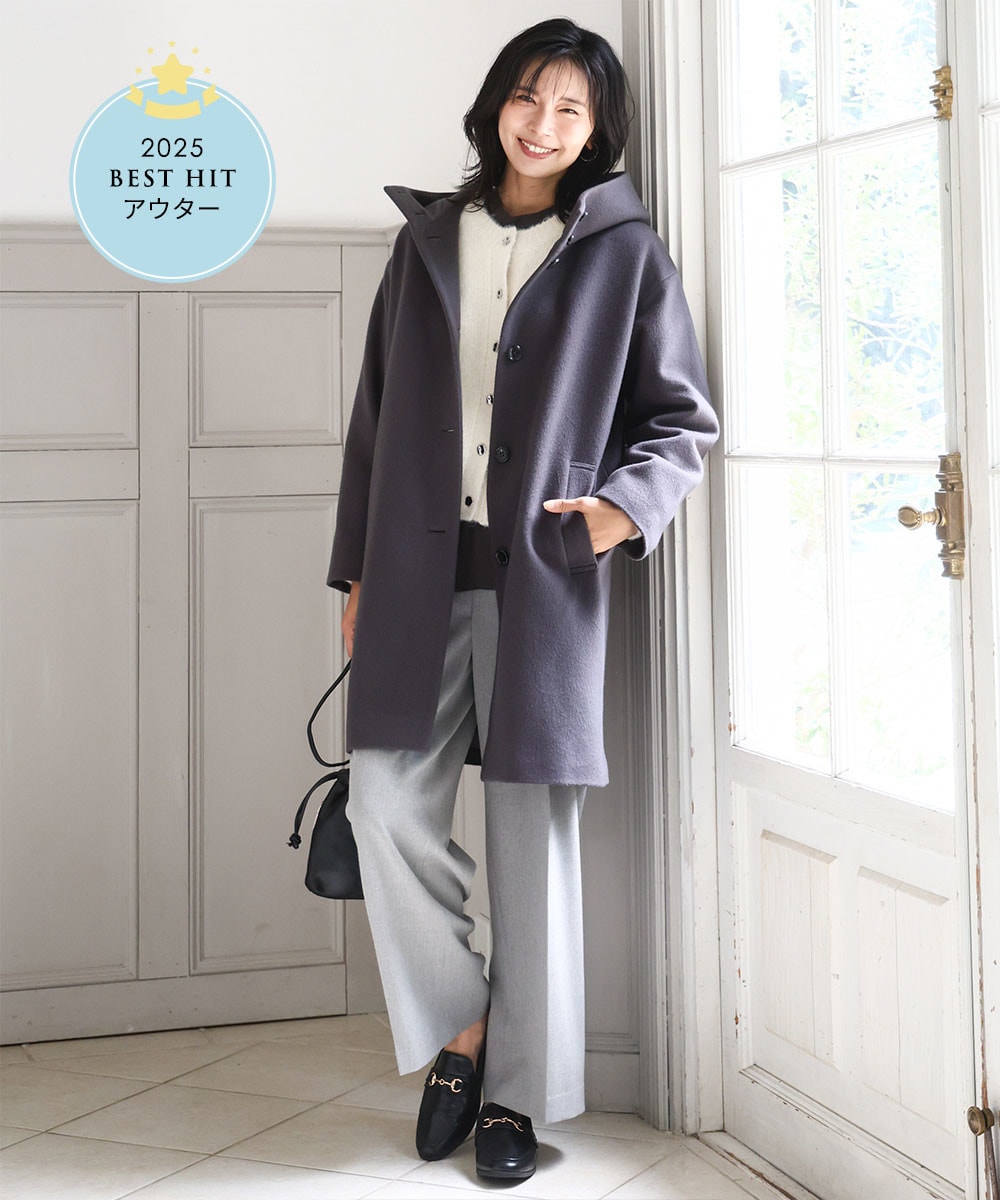 フードがきれいに立ち上がるパターンにこだわったウールコートはどの角度から見ても素敵に。大人カジュアルな気分にぴったりなアウターは、ゆとりのあるシルエットでラクチンな着心地ながら、着用したときにはすっきり見えるサイズ感にこだわりました。