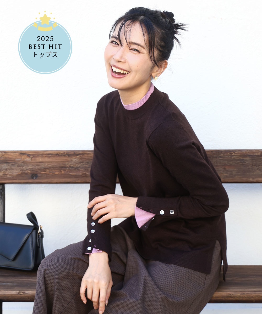 何枚あっても欲しくなるハイゲージのシンプルニットは、配色レイヤードのデザインのテクニックが可愛い。ちらりと覗くきれいな色合いは冬のコーデのポイントにも映えます。