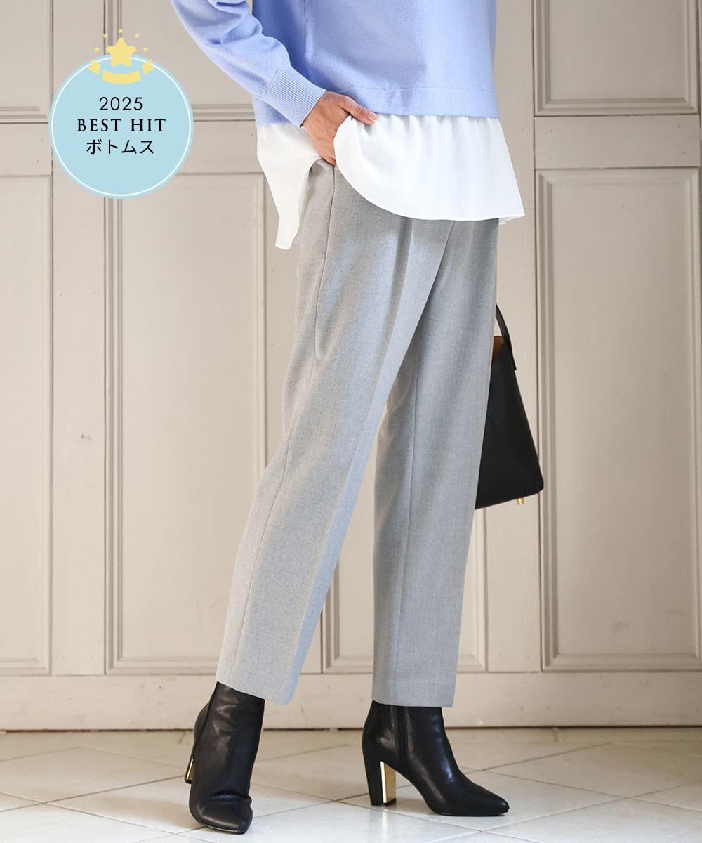 スタッフ所持率NO.1の人気パンツが今年もベストセラーに。コーデに映えるきれい色も素敵ですが、やっぱり人気はダークグレーがNO.1。デザイン違いのブラウスとセットアップで購入する人も多いMKの名品アイテムです。