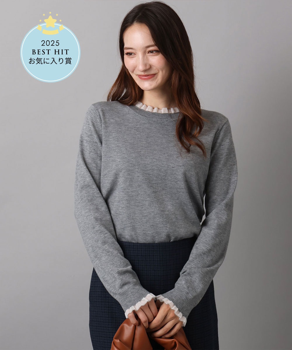 ハイゲージのニットはインナー使いにもちょうどいい。衿元と袖口のフリルデザインがほかと差を付けるデザインで、色違い買いもおすすめです。