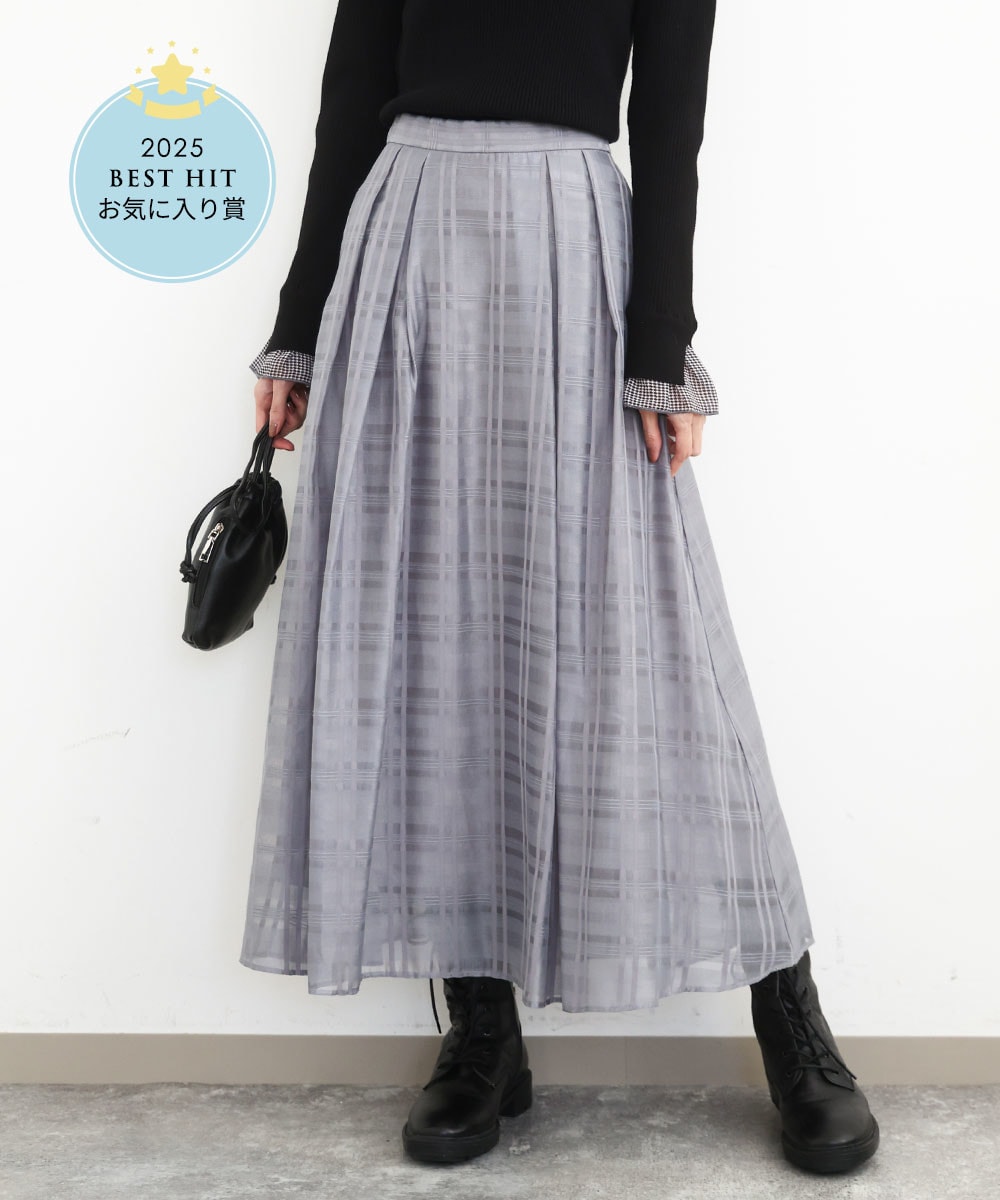 シアーなチェック柄はシーズンレスで着回せる優れもの。シンプルなコーデにも映えるスカートは、着こなし次第で、きれいめもカジュアルもどちらの着回しも楽しめます。