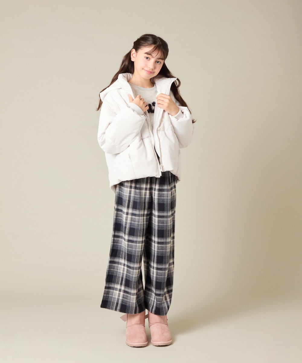 ふんわり白ダウンにチェックパンツを合わせて、