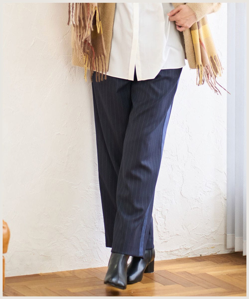 ・ツヤ感のあるサイドラインとピンストライプ柄がアクセントのワイドパンツ。