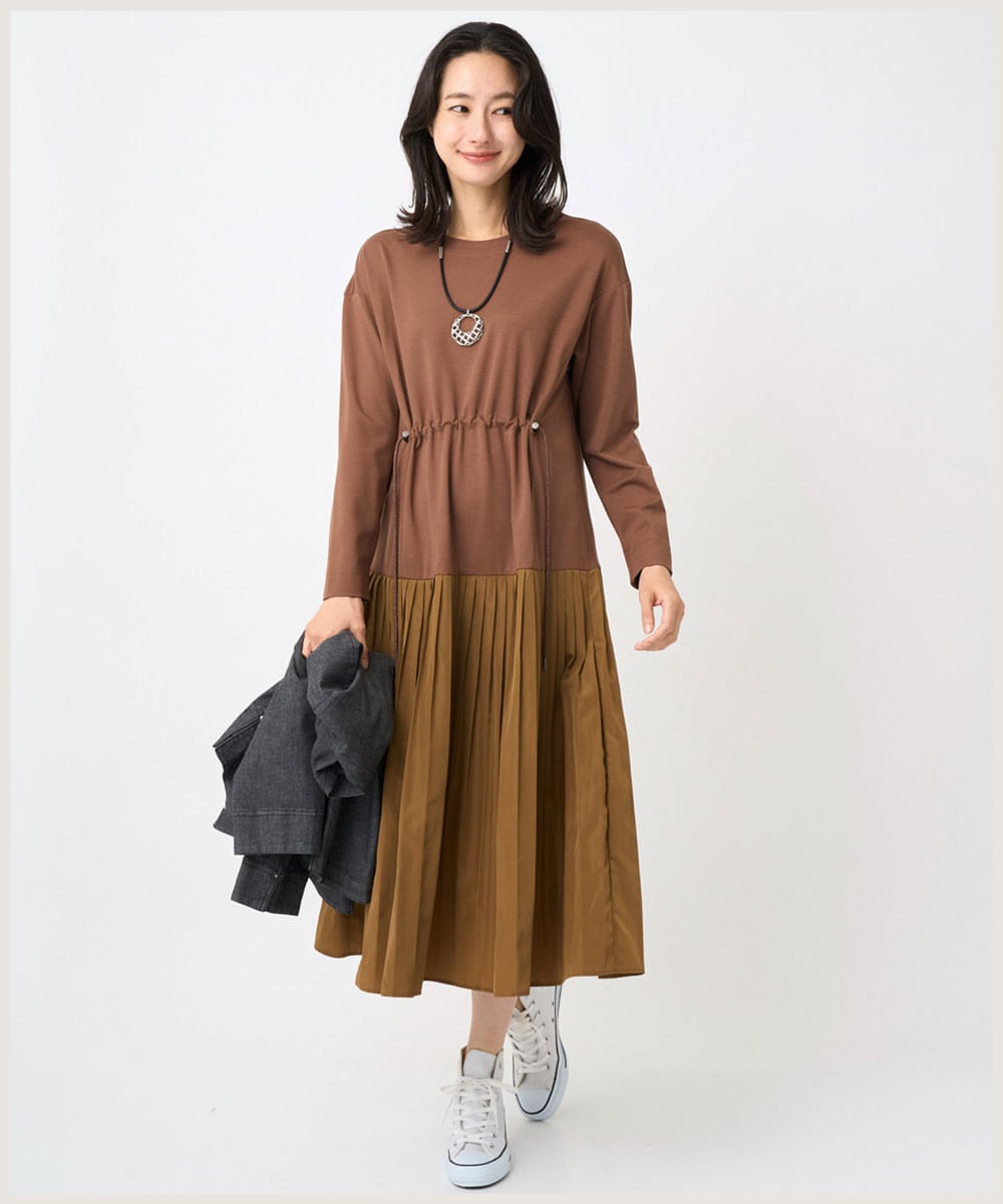 ・薄手のジャージーとポリエステルタフタをドッキングした一枚着のワンピースです。