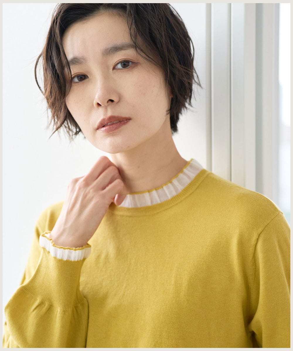・控えめなシアーフリルを首元と袖口にあしらった、大人可愛い雰囲気のデザインニット。