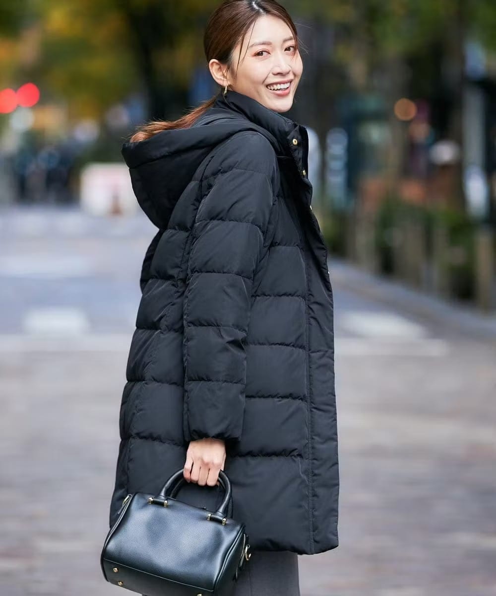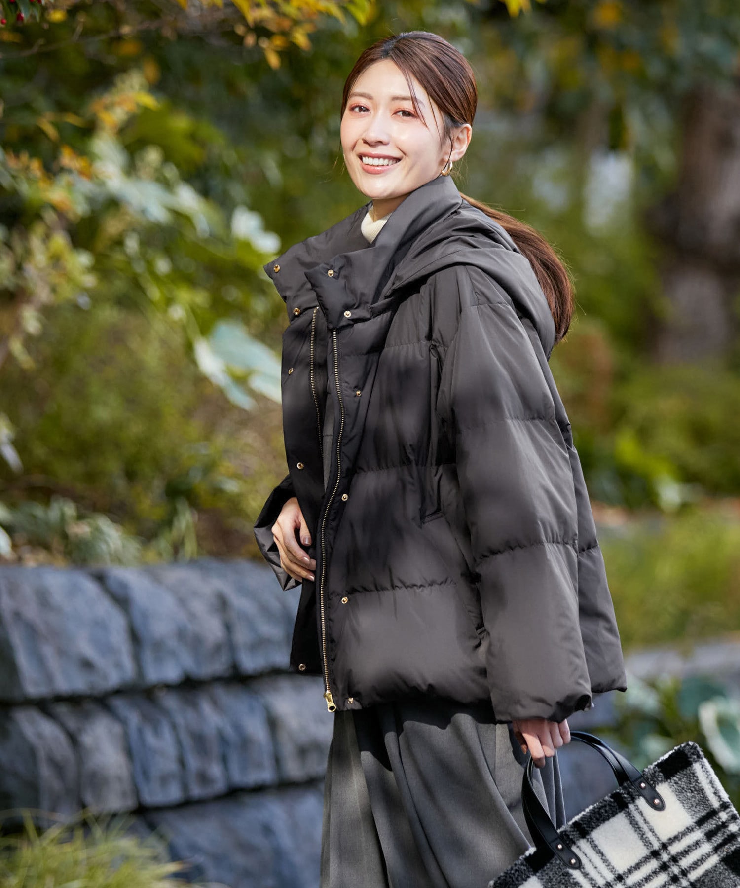 ダウン&フェザーを使用したベーシックなロング丈ダウンコート。フードはファスナー取り外しで2WAY仕様に!通勤シーンにも使える大人っぽい雰囲気も人気の理由。