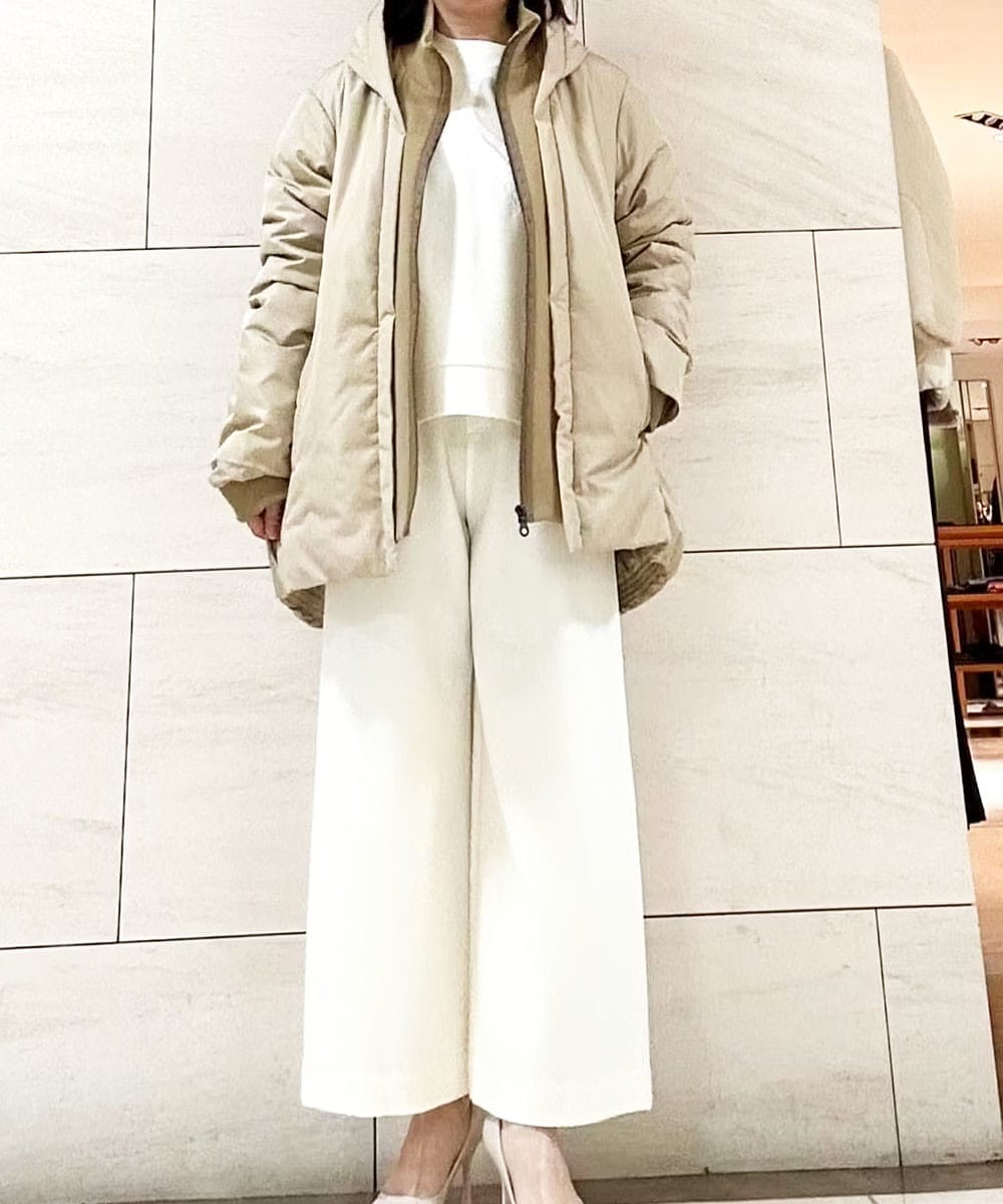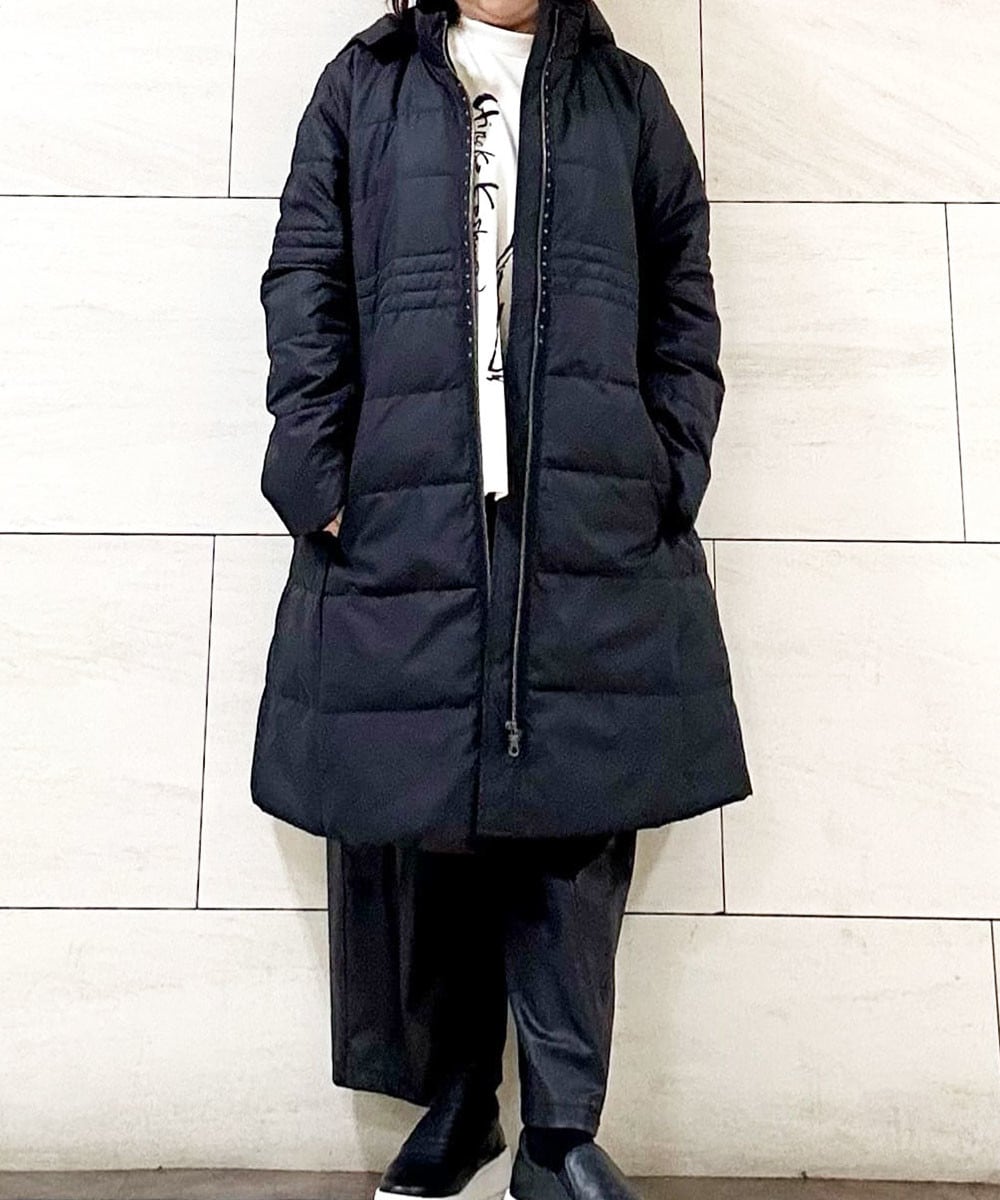 エコダウンキルティングコートは腰まで包み込むミドル丈と綺麗なシルエットがポイント。
