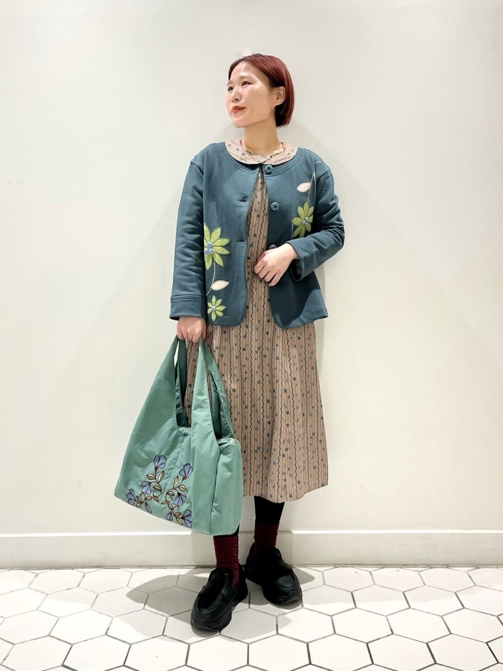 女性らしい襟のデザインが大人かわいい印象を後押しします。グリーンのカーディガンを合わせることで、統一感が出てまとまりのある印象に◎フラワープリントのバッグで春らしさもアップします。