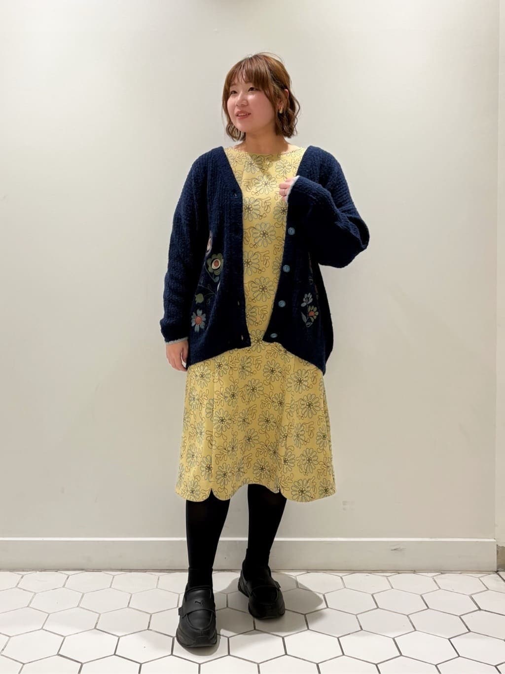 ゆとりを持たせつつもサイドの切り替えで叶うすっきり見えのシルエットです。大ぶりなお花の刺繍が目を惹く、華やかな一枚◎ネイビーのカーディガンを合わせれば上品な印象に仕上がります。