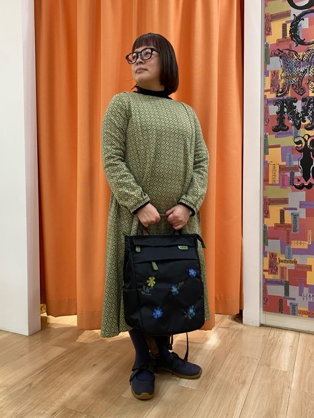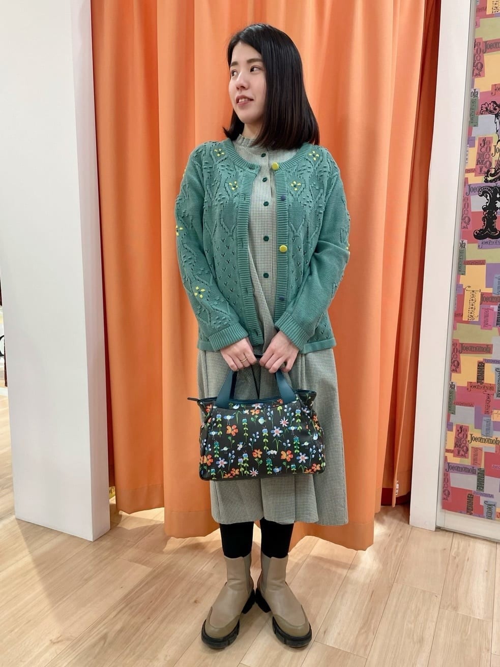 変形ストライプ柄と手描き風のお花柄をプリントしました。羽織とバッグをグリーンで統一し、落ち着きのある大人かわいいコーデに◎ロングシーズン着用しやすいさらりとした肌触りの生地感です。