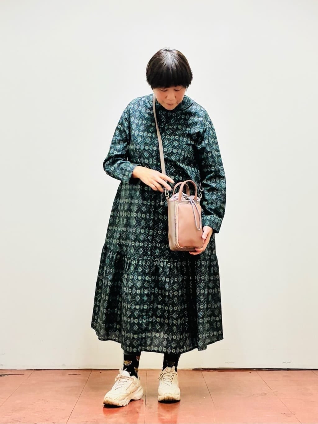 幾何調のプリントを全面に施したワンピース。