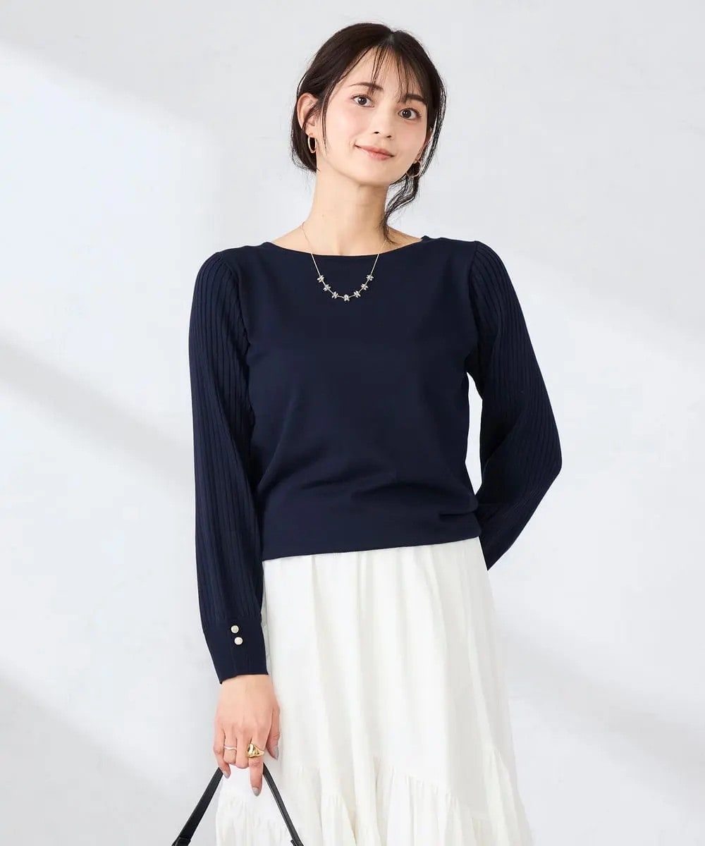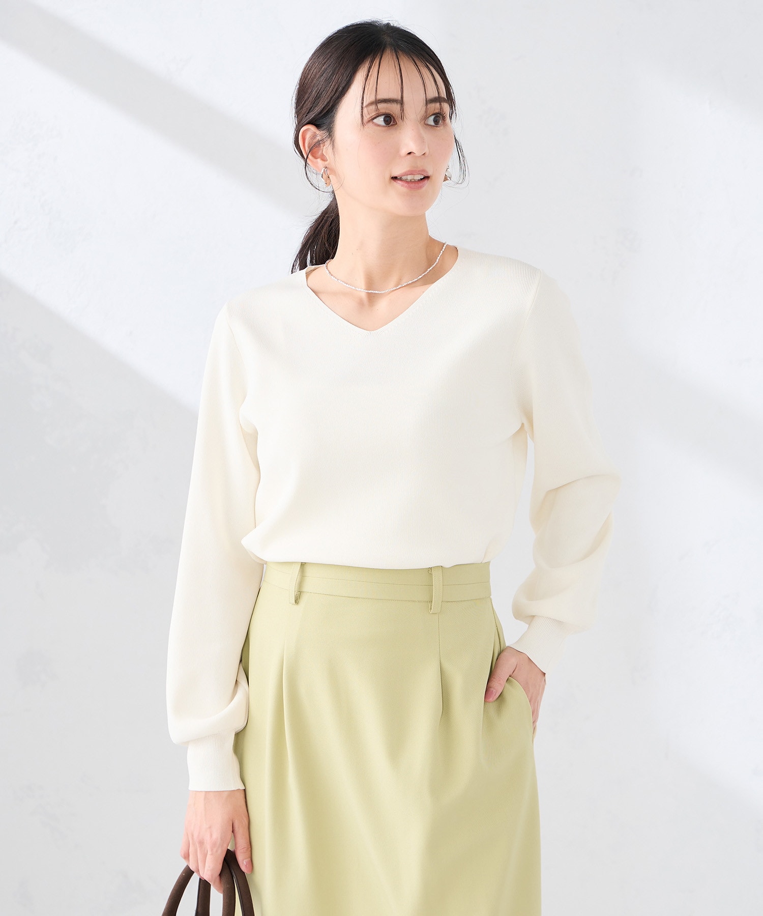 ベーシックを格上げするプリーツスリーブニット。ぽわんとしたプリーツ袖と飾りボタンが女性らしく華やかなデザインで一枚でも着映える汎用性の高い一着。通勤のジャケットインから休日のスカートスタイルまでシーンレスに着回せます。