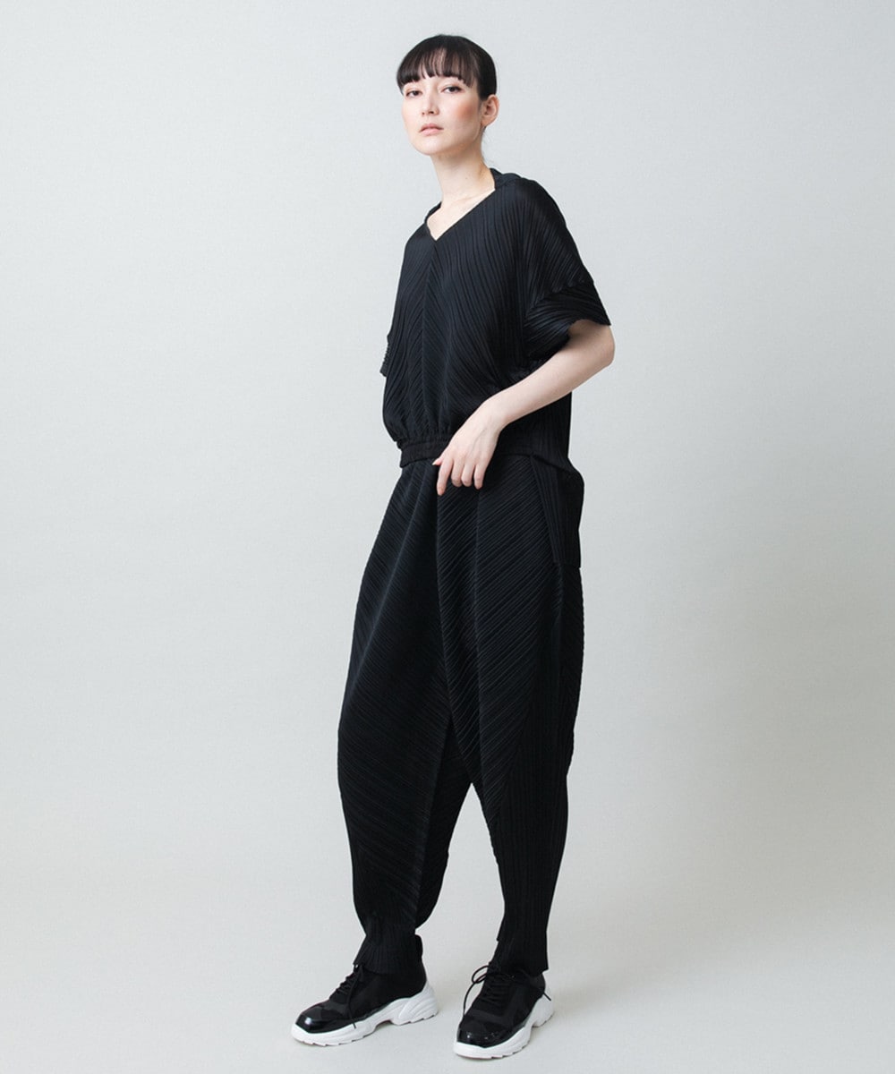 同素材のパンツと合わせたモードで優美なセットアップもおすすめです。