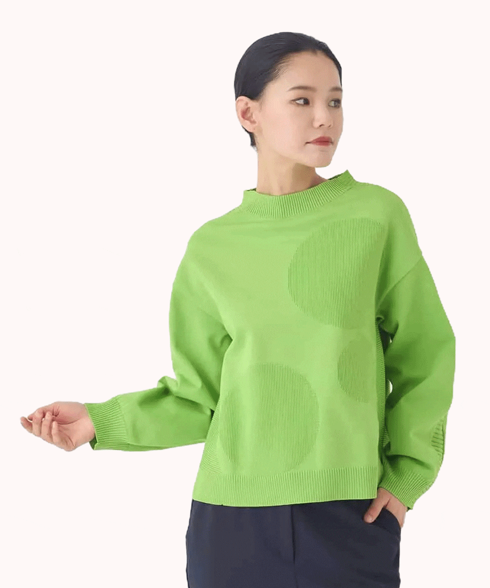 袖やバックの編み地切り替えデザインが後ろ姿まで印象的に演出。