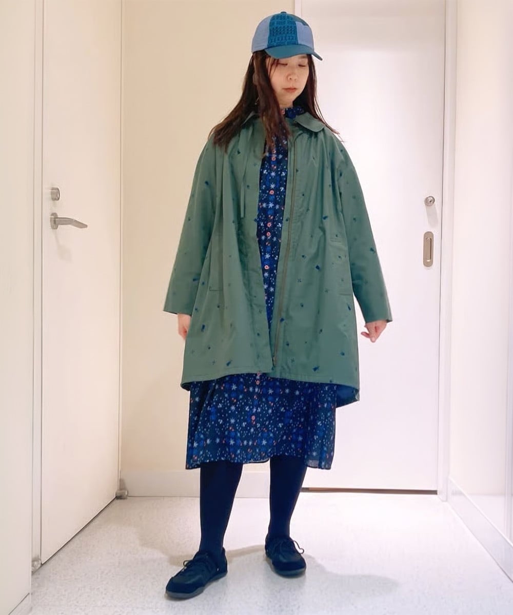 グリーンの刺繍ロングコートに、ブルー系のワンピースを合わせたカラーコーデ。落ち着いたトーンでまとめ、柄アイテムも派手になりすぎずにほどよい存在感に仕上がります。さらにパッチワークのキャップがポイントとなり、春のお出かけに最適なカジュアルコーデが完成します◎