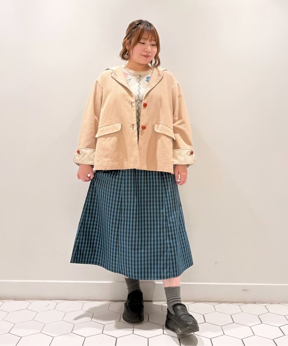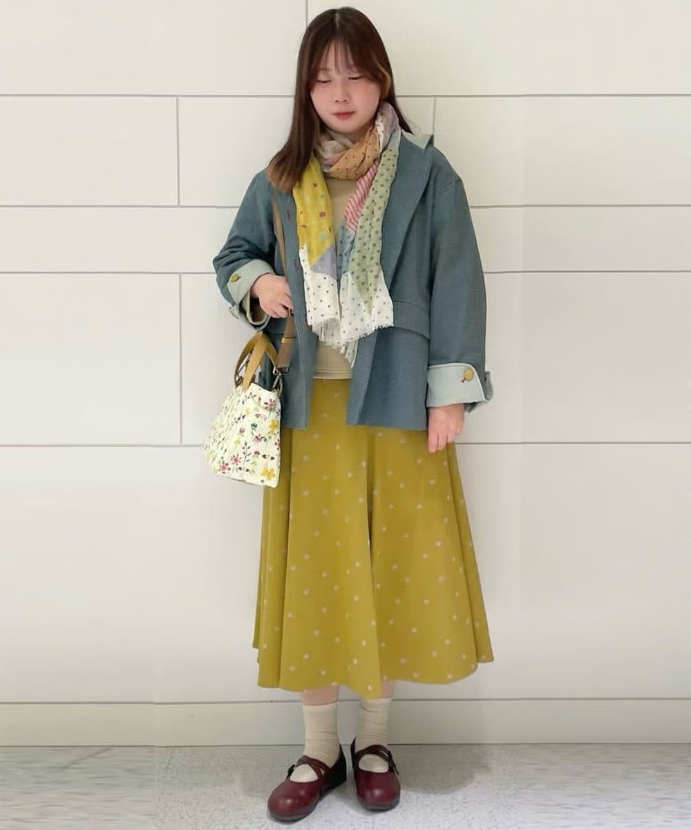 緑の千鳥チェックジャケットと黄色のドットスカートを合わせたレトロなコーデ。ジャケットのフード裏、カフス裏には無地の別布を使用しておりアクセントに。首元のカラフルな柄スカーフは統一感のある印象を後押しします。さらに花柄のバッグを合わせ、春らしさ満点のコーデに◎
