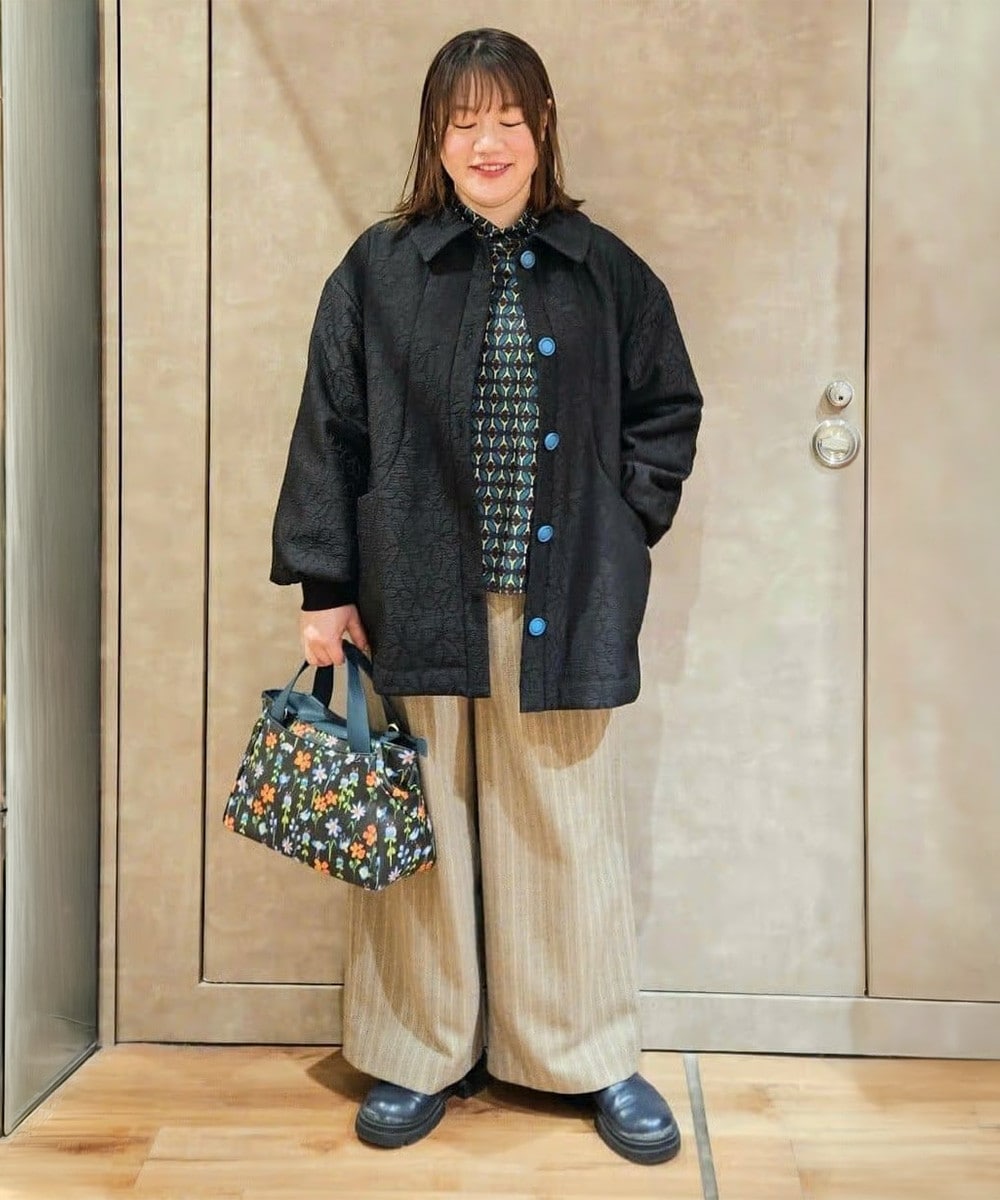 フラワージャカードコートにとベージュのパンツを合わせたカジュアルコーデ。インナーには幾何学柄を合わせて、さりげない華やかさをプラス。シックなコートに落ち感のあるワイドパンツを合わせることで抜け感を演出します。柄バッグを効かせた大人のカジュアルコーデです。