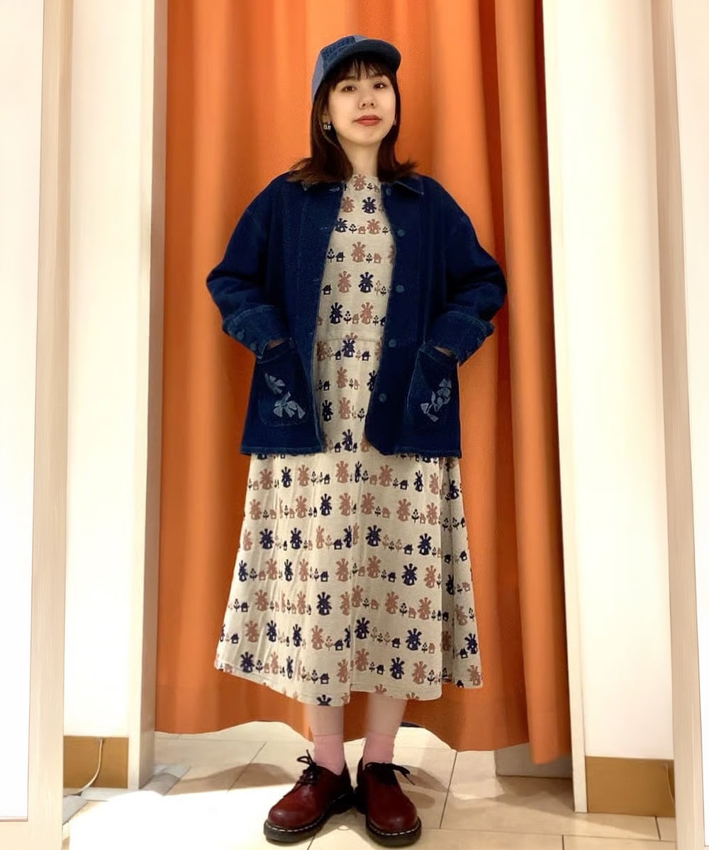 デニムと柄ワンピースを合わせた大人かわいいコーデ!存在感のあるワンピースとシンプルなデニムジャケットが相性抜群です。ジャケットはドロップショルダーでリラクシーな着用感が魅力。パッチレースのキャップで華やかさをプラス◎