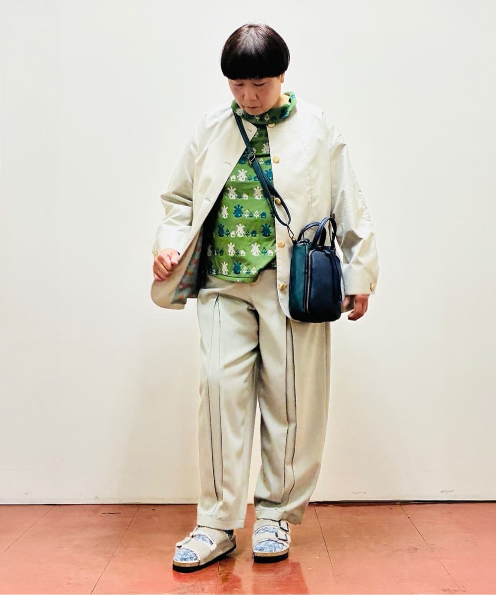 柔らかなベージュのジャケットに鮮やかなグリーンを効かせた春らしいスタイリング。軽やかな配色が、シーズンムードをぐっと高めてくれます。ノーカラーデザインが上品さを演出しつつ、ゆとりのあるパンツでほどよい抜け感をプラス。柄トップスやカラー小物でアクセントを加えた、春のお出かけにおすすめのコーデです◎