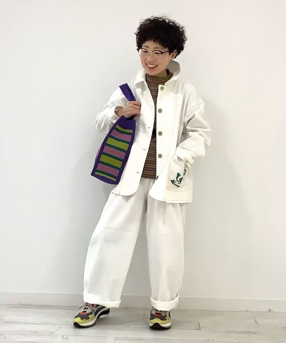 ホワイトデニムのセットアップコーデ!清潔感ときちんとさがあり、カジュアルになりすぎない大人の雰囲気を演出します。大きめのパッチポケットに施したお花のプリントがポイント。ホコモモラの柄物アイテムとの相性抜群です◎