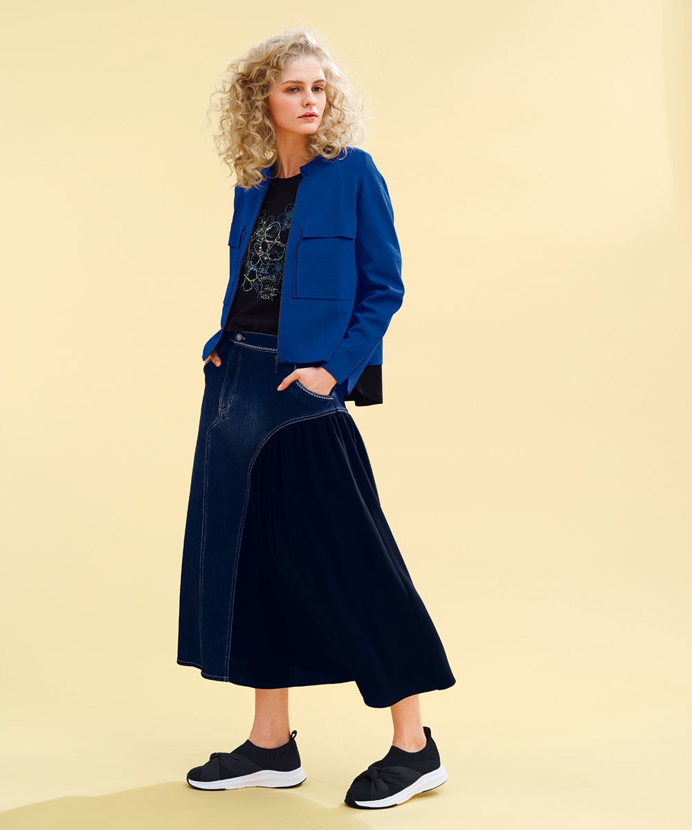 新しい一歩を踏み出せる、自然と心が浮きたつ季節が到来!! 身にまとうだけでしゃれ見えが叶うデニムとジョーゼットジョイントのリメイク風スカートをチョイスして。