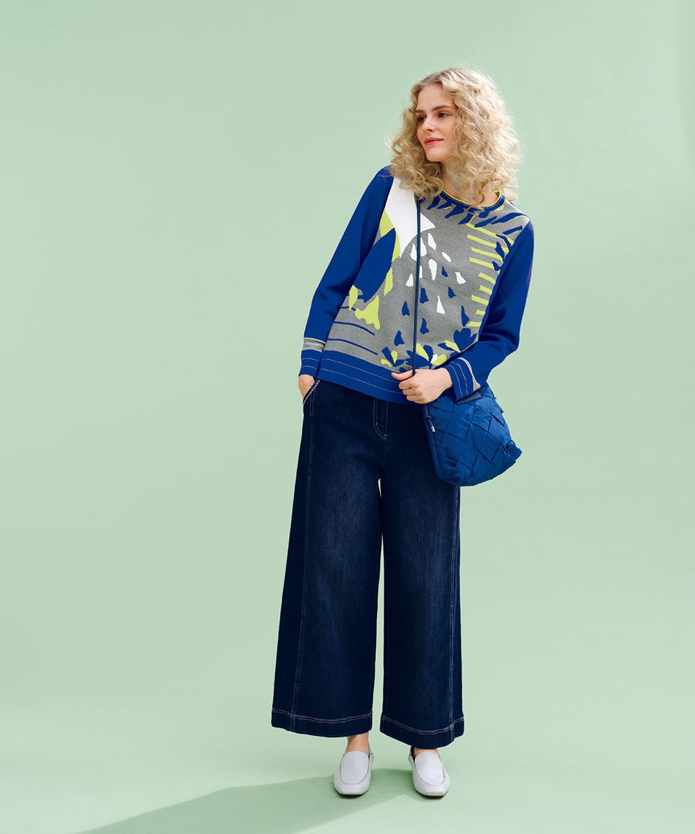 毎日の装いをいつもより少し自由に大胆に、キャンバスに描いた様なジャカードニットで新風を。端々しいフレッシュなカラーがなんとも軽やか。