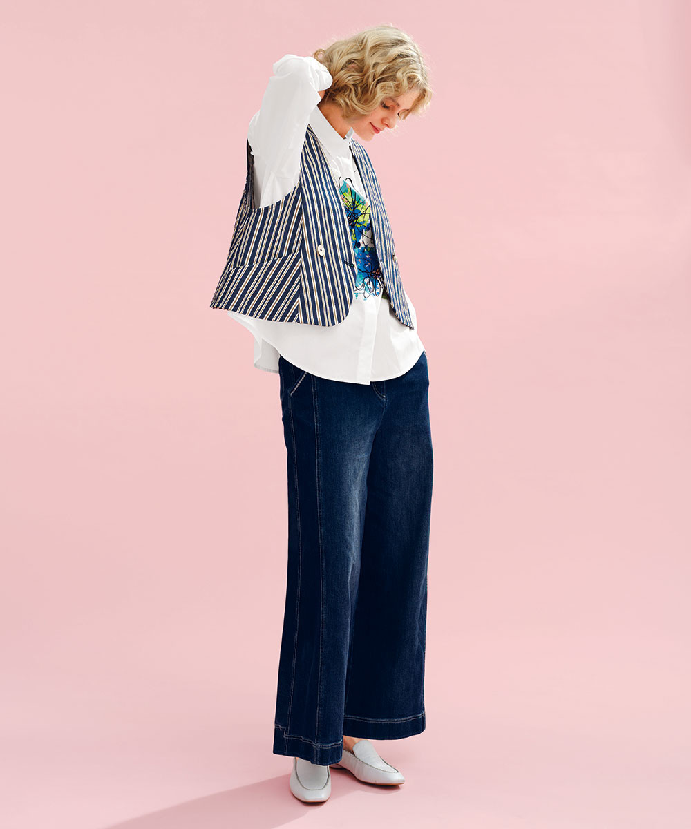 プレイフルなストライブが目をひくショートタイプのジレをインパクトのあるアーティスティックなフラワーが華を沿えるシャツにON。