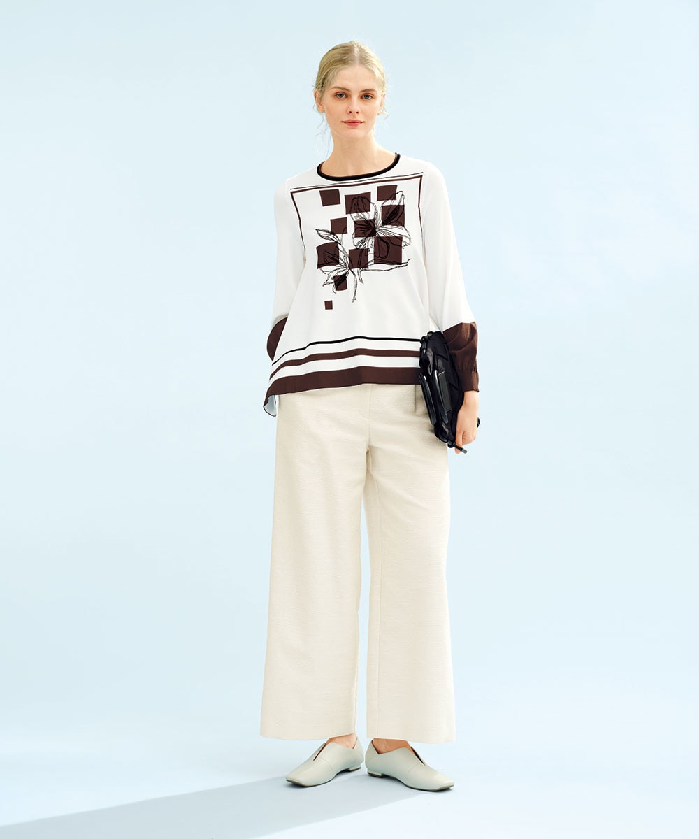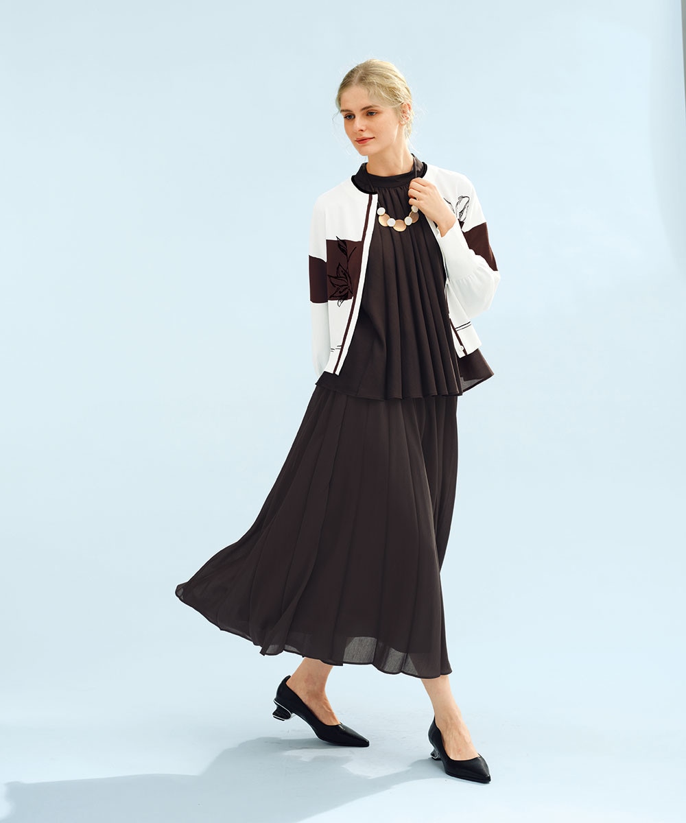 柔らかく揺れ動くシアーな表情が気品をもたらしてくれるセットアップに、フラワー刺繍をきかせたカラーブロッキングカーディガンを羽織って小粋に。