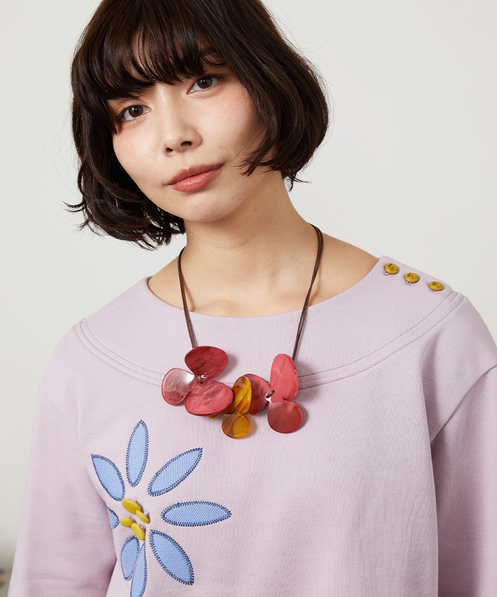 顔周りが華やかに見える大ぶりなネックレス。肌馴染みのいいカラーが取り入れやすいのも嬉しいポイントです。