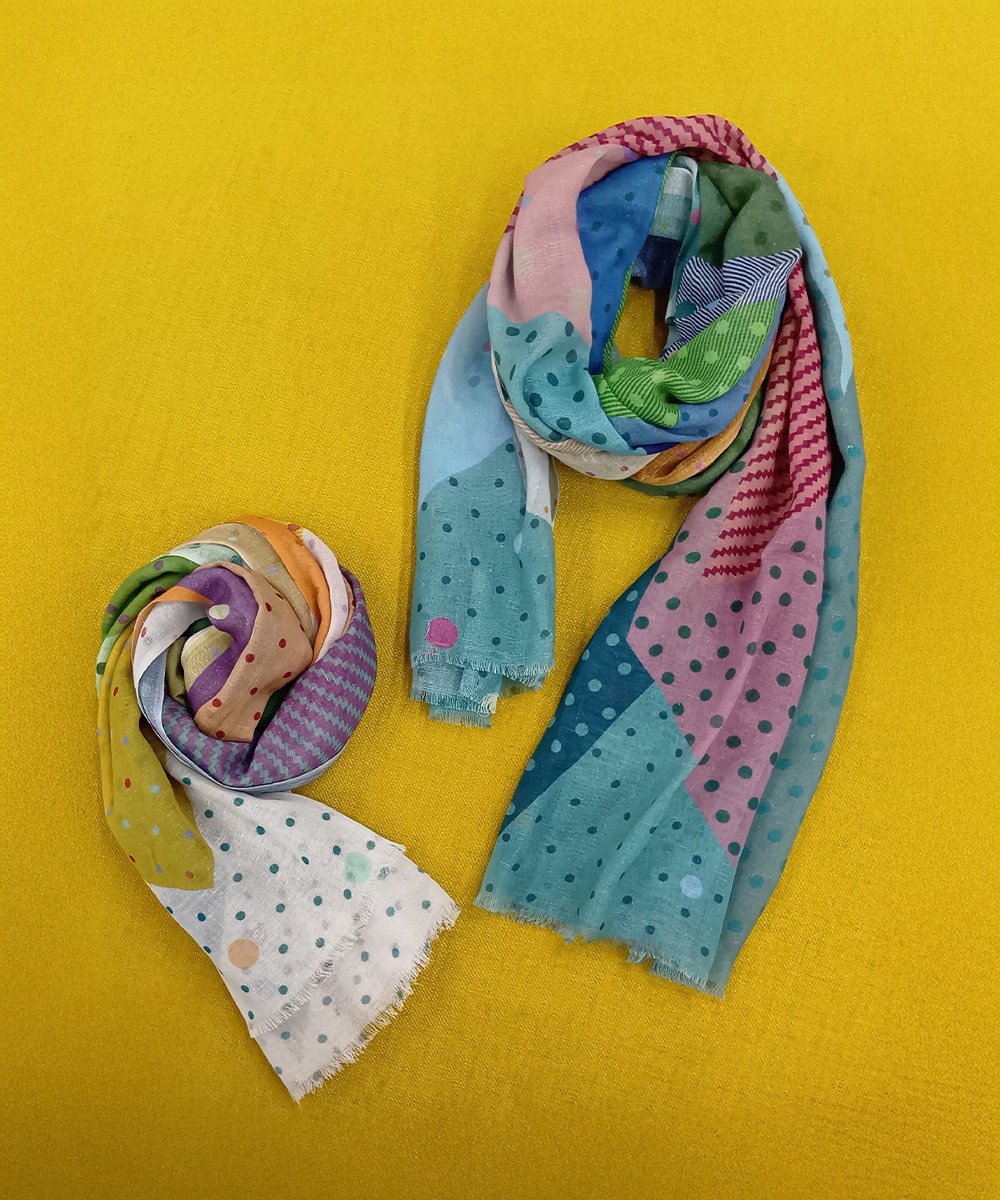 春の日差し除け、肌寒い朝夕にも便利なストール。マルチカラーはどんな色味のお洋服とも相性◎