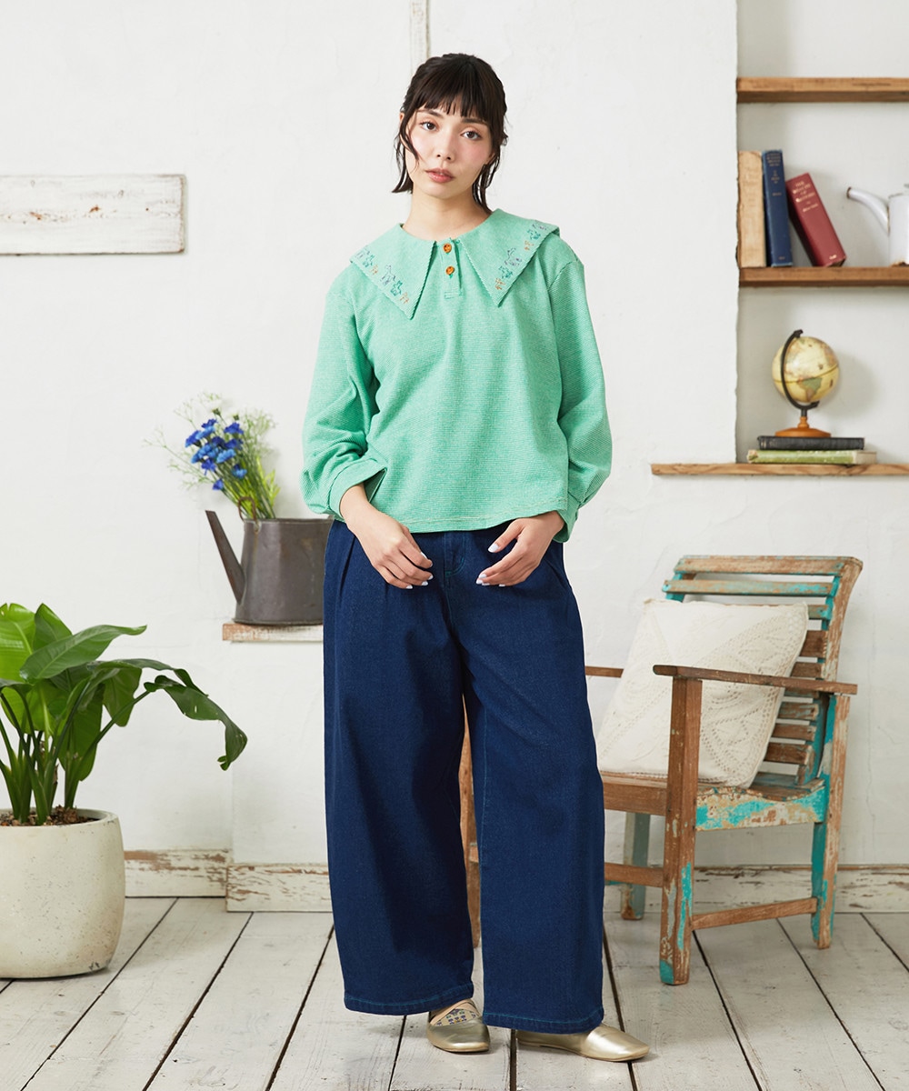 Aventura アニマルアップリケパーカーと同素材のカットソー。大きめの襟がデザインポイントで、後ろ側はセーラー風にしています。襟端にぐるりと施したライン刺繍のモチーフが華やかさをプラス◎ポロシャツのように気軽に着用してほしいひと品です。