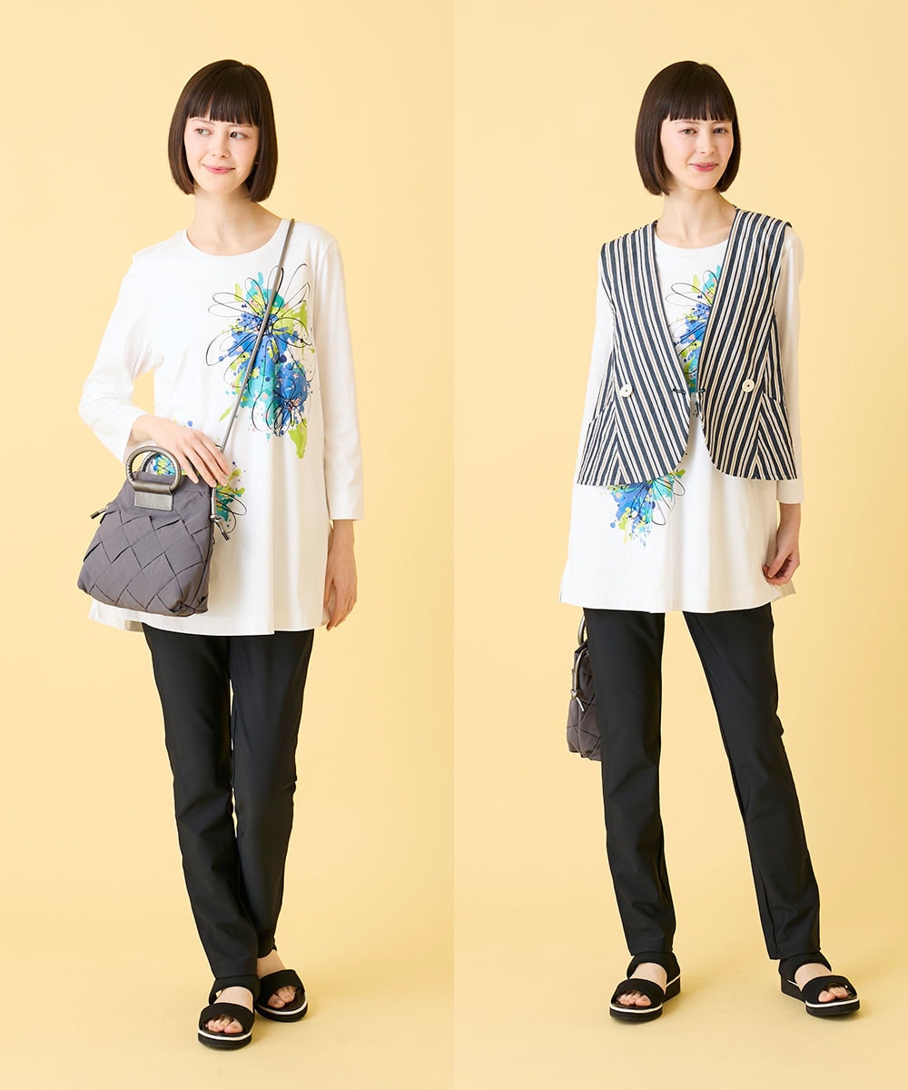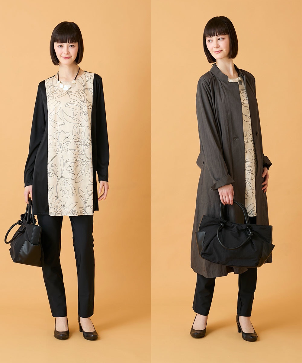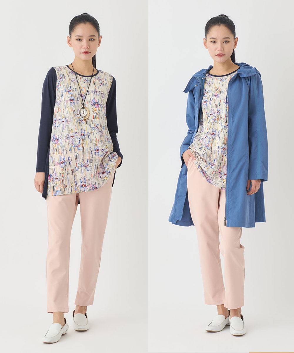 春を感じる配色がプリントの美しさを引き立て、大人の女性にふさわしい洗練された印象に仕上げました。すらりと伸びるチュニック丈のシルエットが気になるラインをさりげなくカバーしながら、自然なスタイルアップを演出します