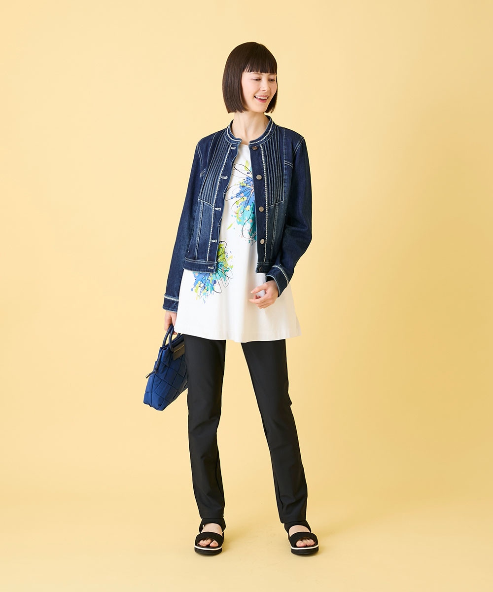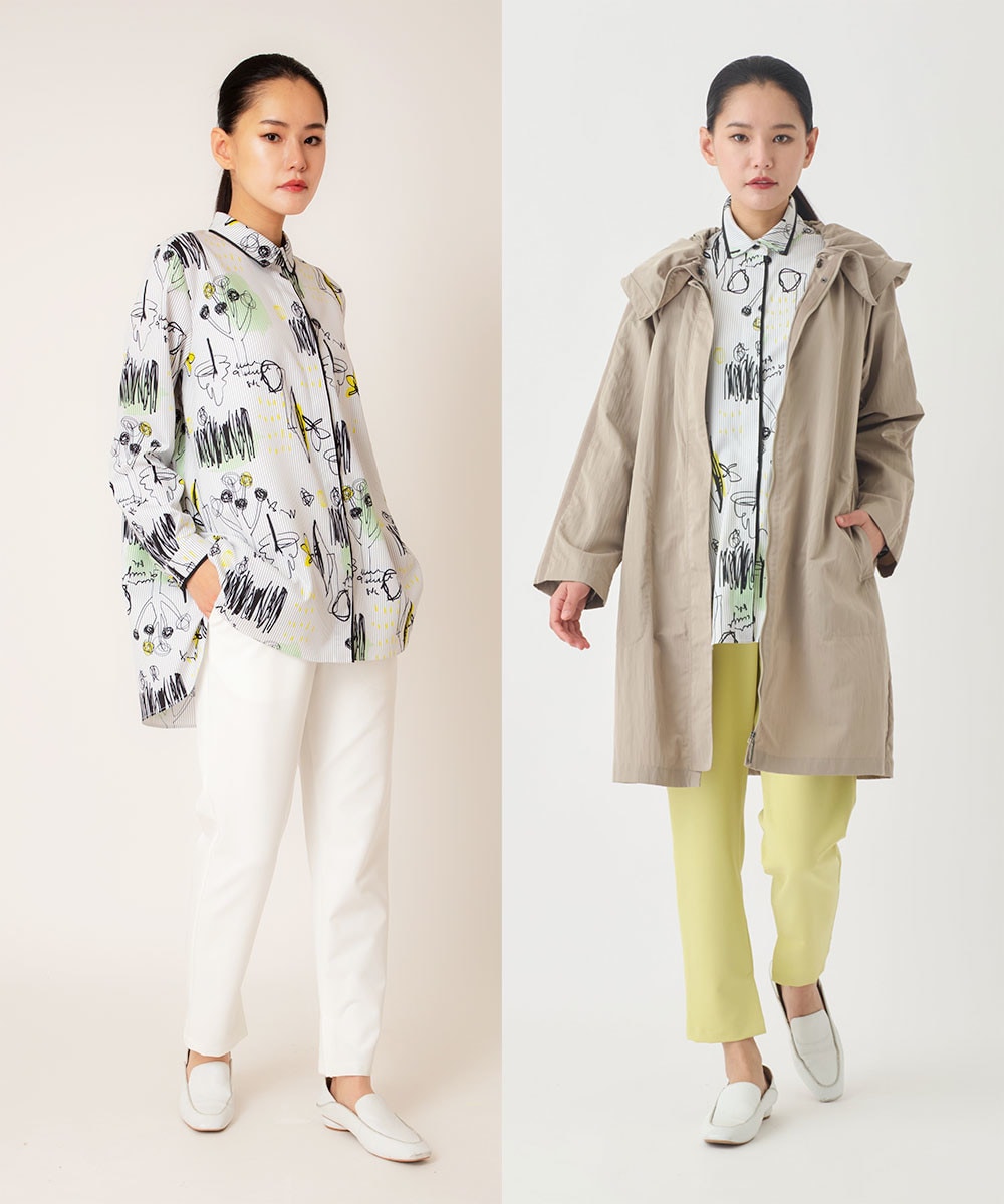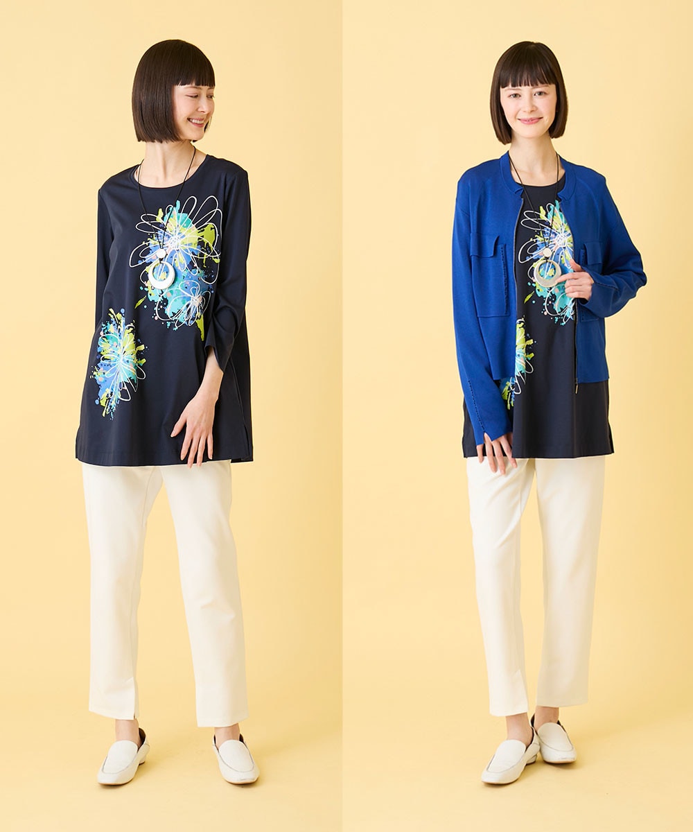 春を感じる配色がプリントの美しさを引き立て、大人の女性にふさわしい洗練された印象に仕上げました。すらりと伸びるチュニック丈のシルエットが気になるラインをさりげなくカバーしながら、自然なスタイルアップを演出します