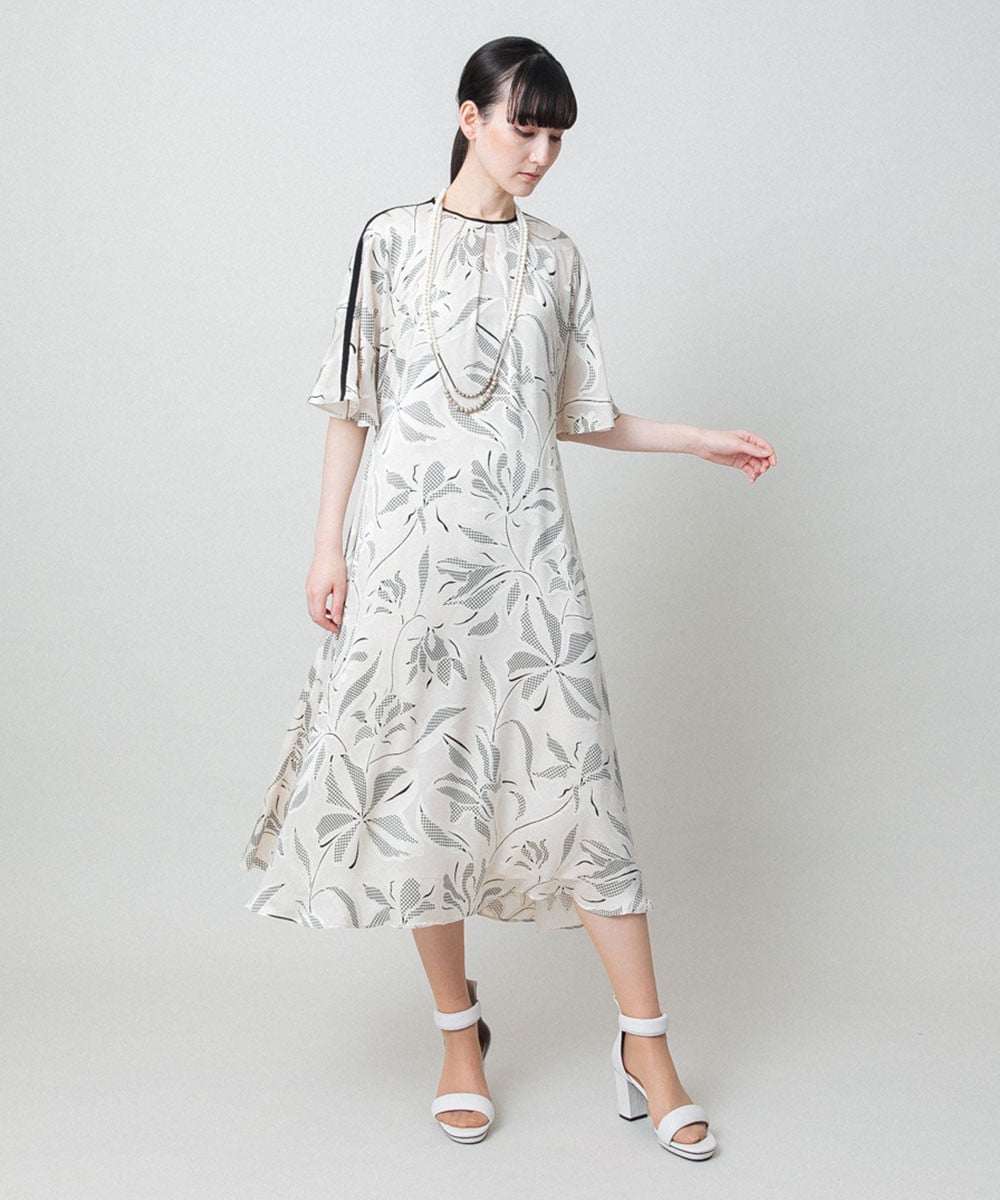 身頃から袖までをひと続きに仕立てた、やわらかく流れるようなシルエットが特徴的なワンピース。