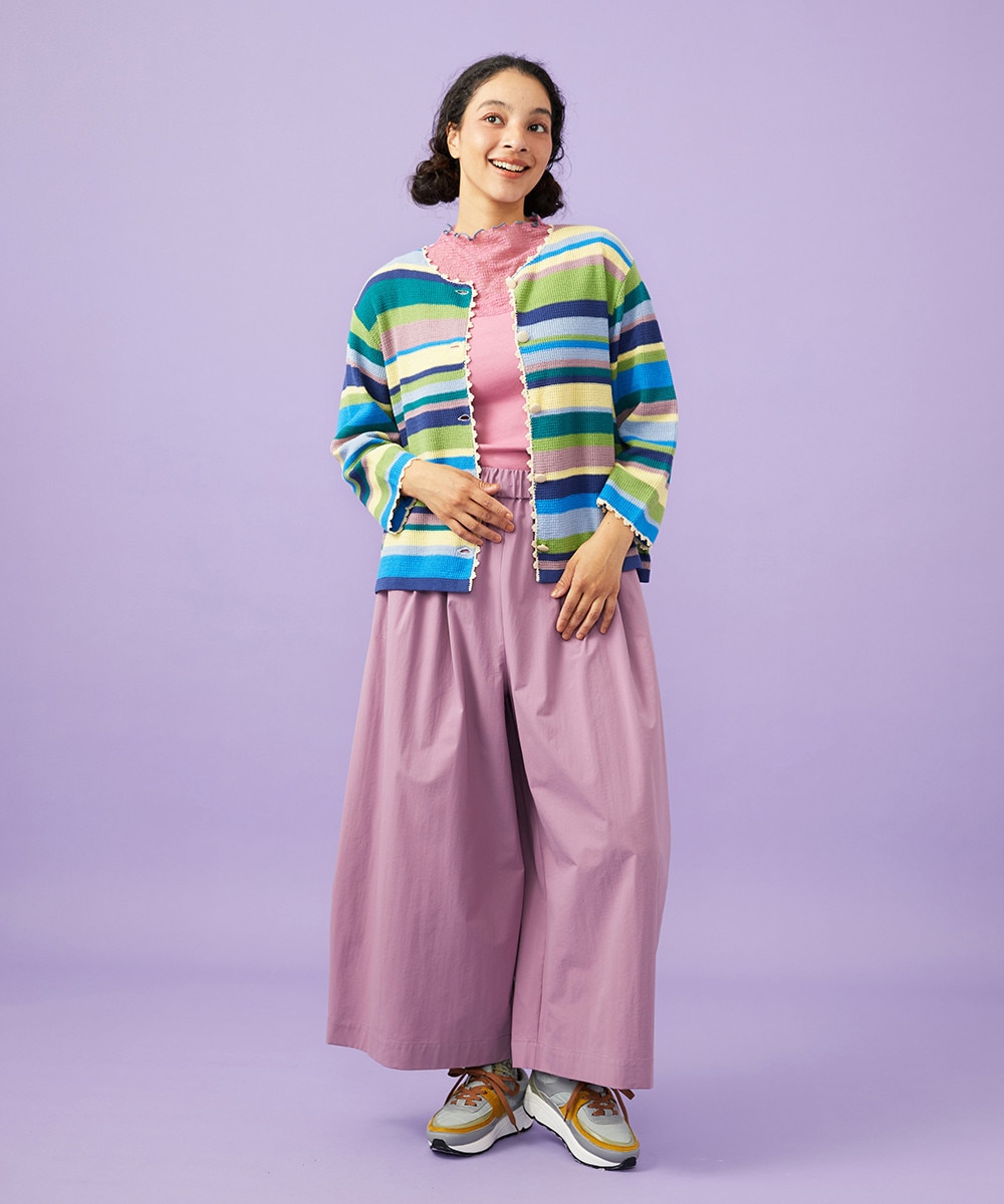 カラフルな配色のボーダーが目を惹くカーディガン。メッシュ編みで表現したコットン素材です。襟ぐり、前立てのかぎ針エジングがポイントとなり、大人かわいい雰囲気に◎丈はほどよいコンパクトさでどんなボトムスにもマッチします。