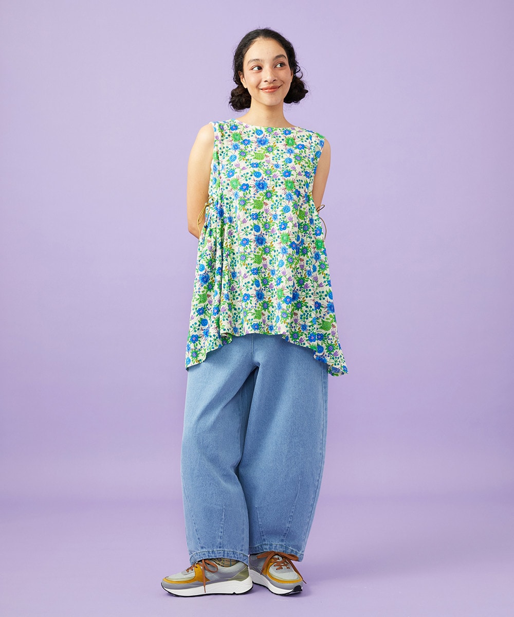 総刺繍生地の上にお花のプリントを施した豪華なブラウス。脇に通した配色紐でシルエットの調節が可能なノースリフレアシルエットです。華やかな配色でシンプルなボトムスと相性抜群◎カーディガンやインナーと組み合わせるとロングシーズンお召しいただけます。