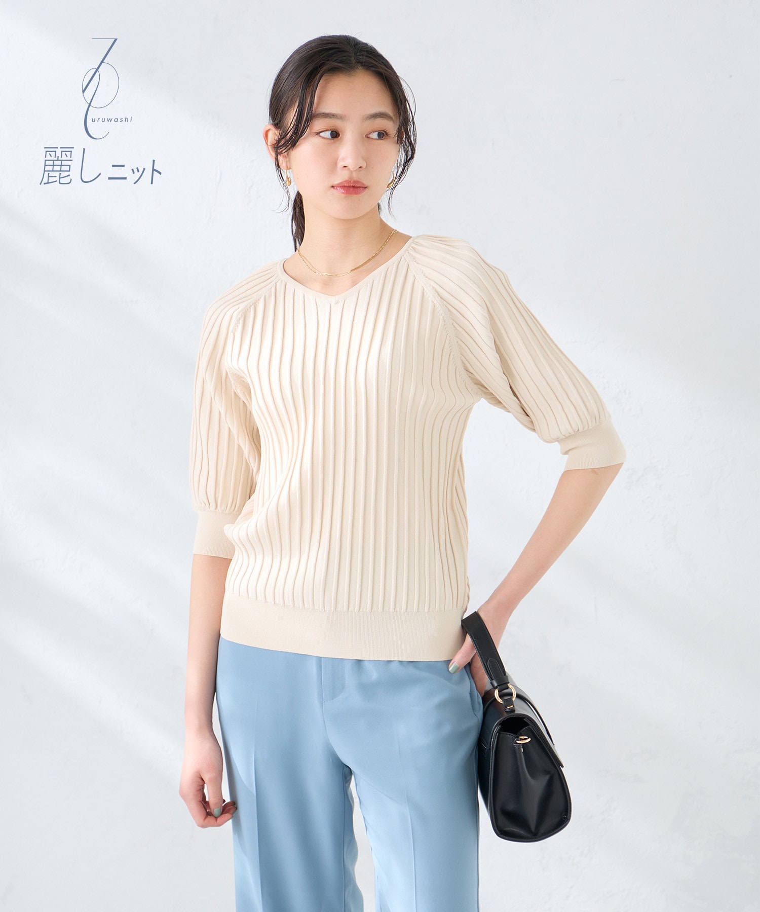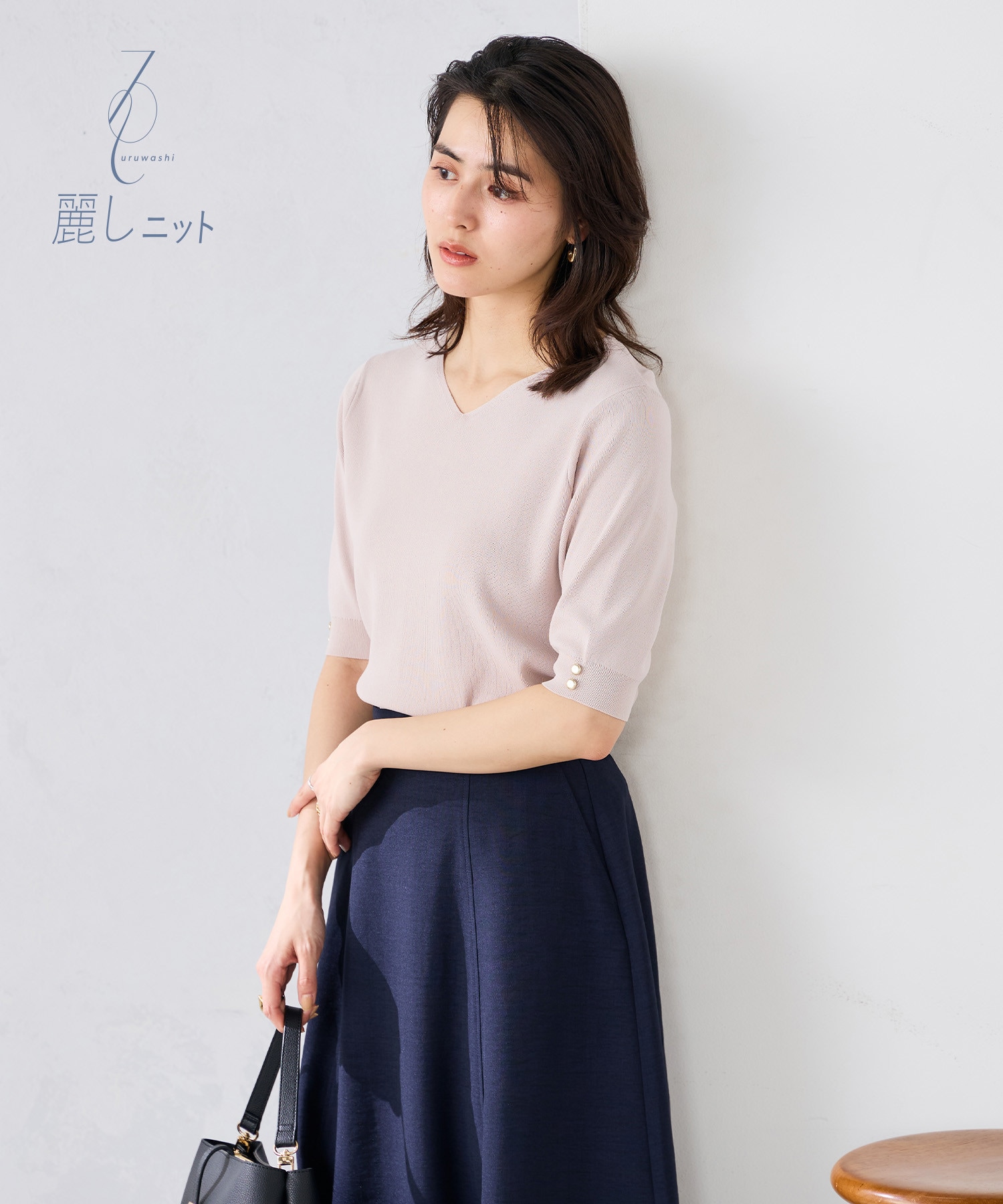シンプルで着回し力は高く、総プリーツ見えで着映えも叶う新定番の七分袖の夏まで着られる着映えニット。