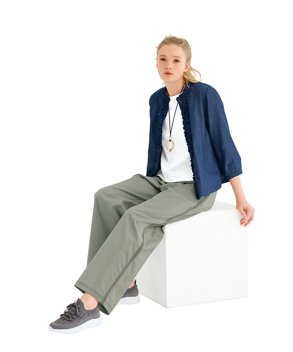 フリルブラウスとユーティリティなパンツ、トーンを抑えた上品な着こなしで、大人に似合うスタイルに。