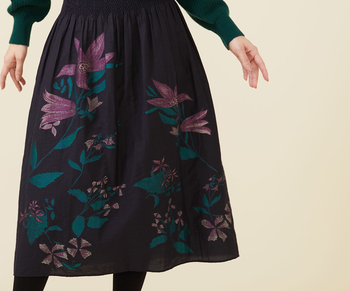 すっきりとしたストライプ状の刺繍と、控えめなスカートのフレアラインが、上品な華やかさを演出します。
