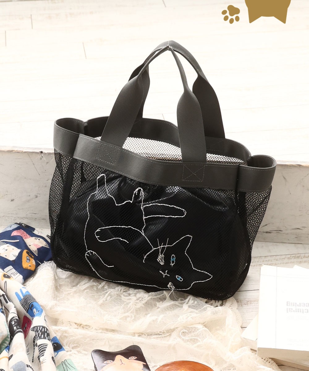 華奢な線のねこの刺繍が施されたメッシュバッグ。