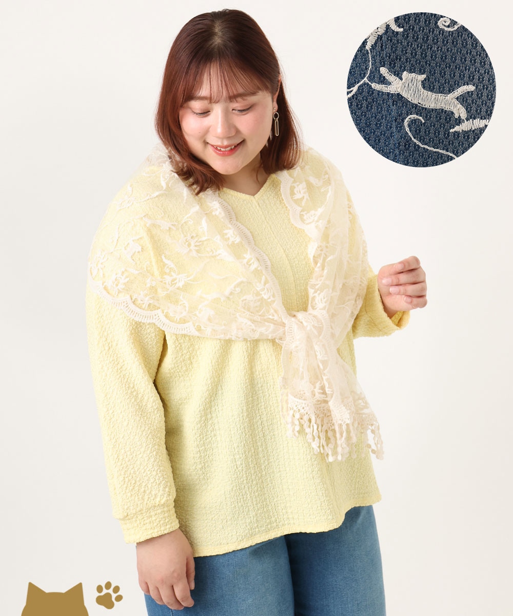 上品な透け感のレース地に、猫のシルエットが刺繍されたレースストールです。