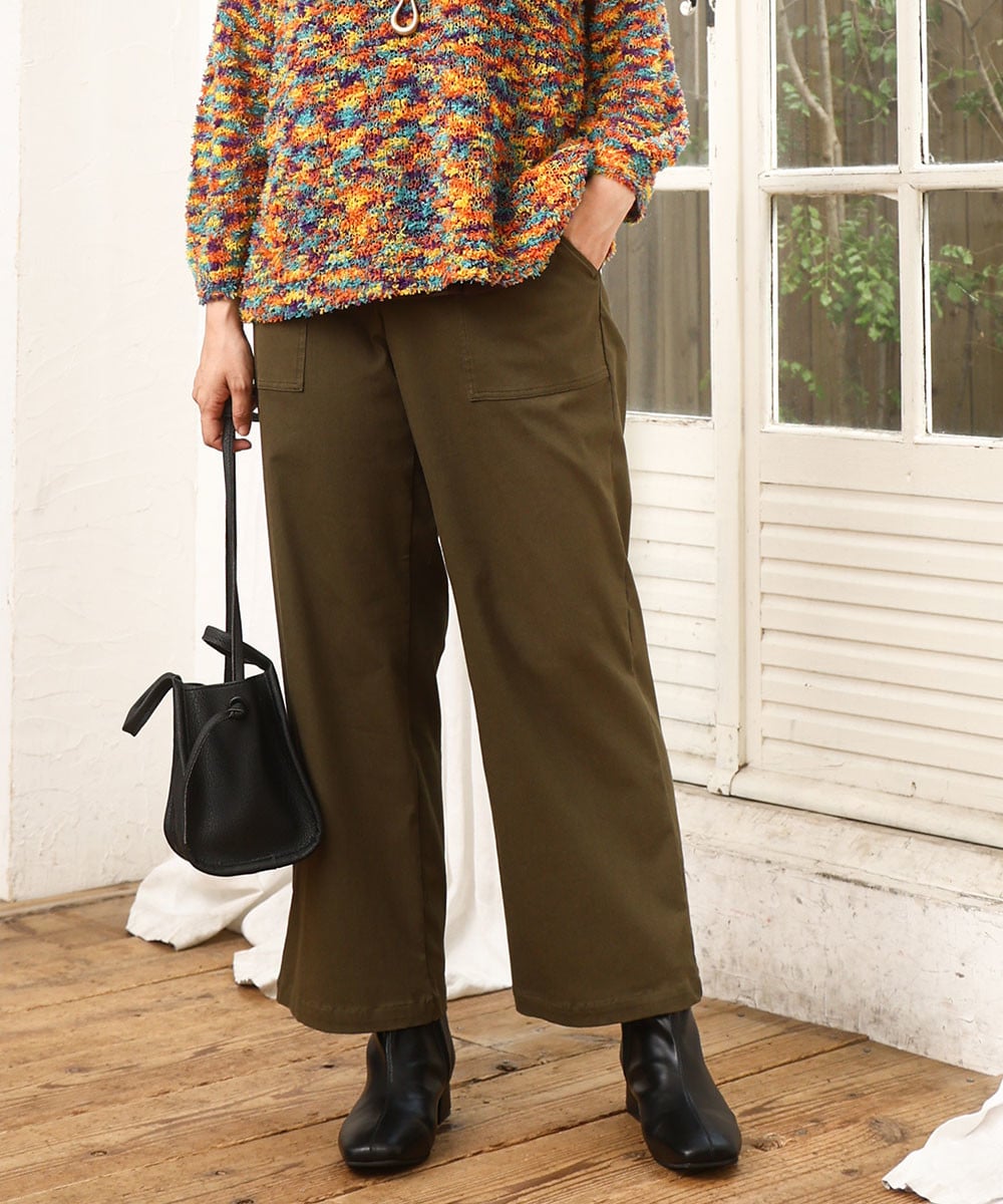 ウエスト周りぐるりゴムの穿き込タイプでストレスフリーな楽ちんパンツ。