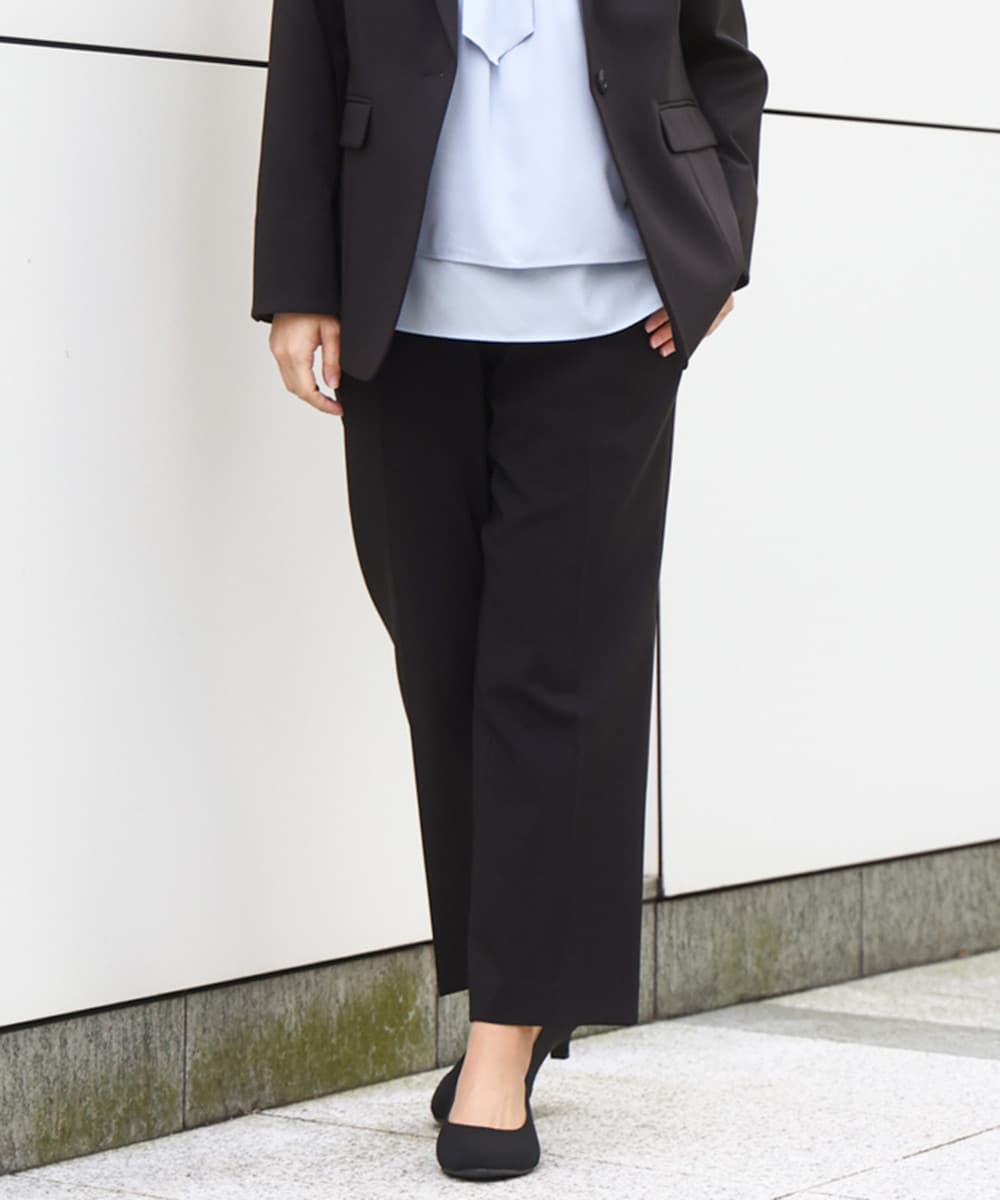 センタープレス入りのすっきりストレートラインのパンツは着用する時期も選ばず、着回し力も抜群です。