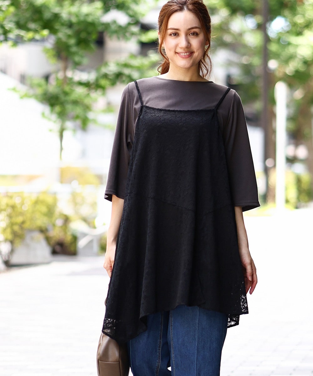 トレンド素材のレース生地を使用したイレヘムの大人可愛いキャミソールチュニックはTシャツとのレイヤードセットで今年らしいスタイリングが簡単に決まります。