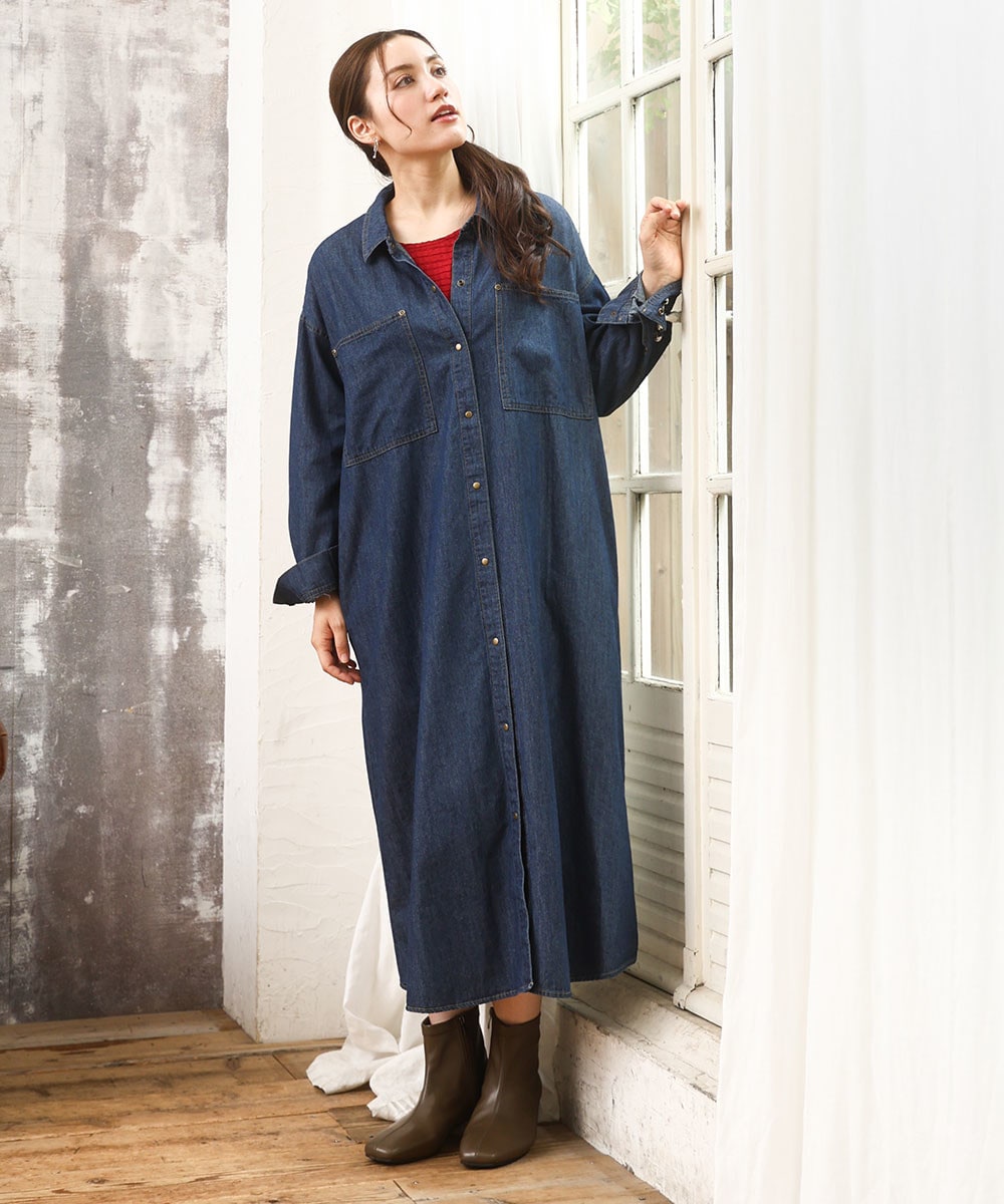 カバーオール風のデザインデニムシャツは羽織としても、ワンピースとしても着まわせるトレンドアイテム。