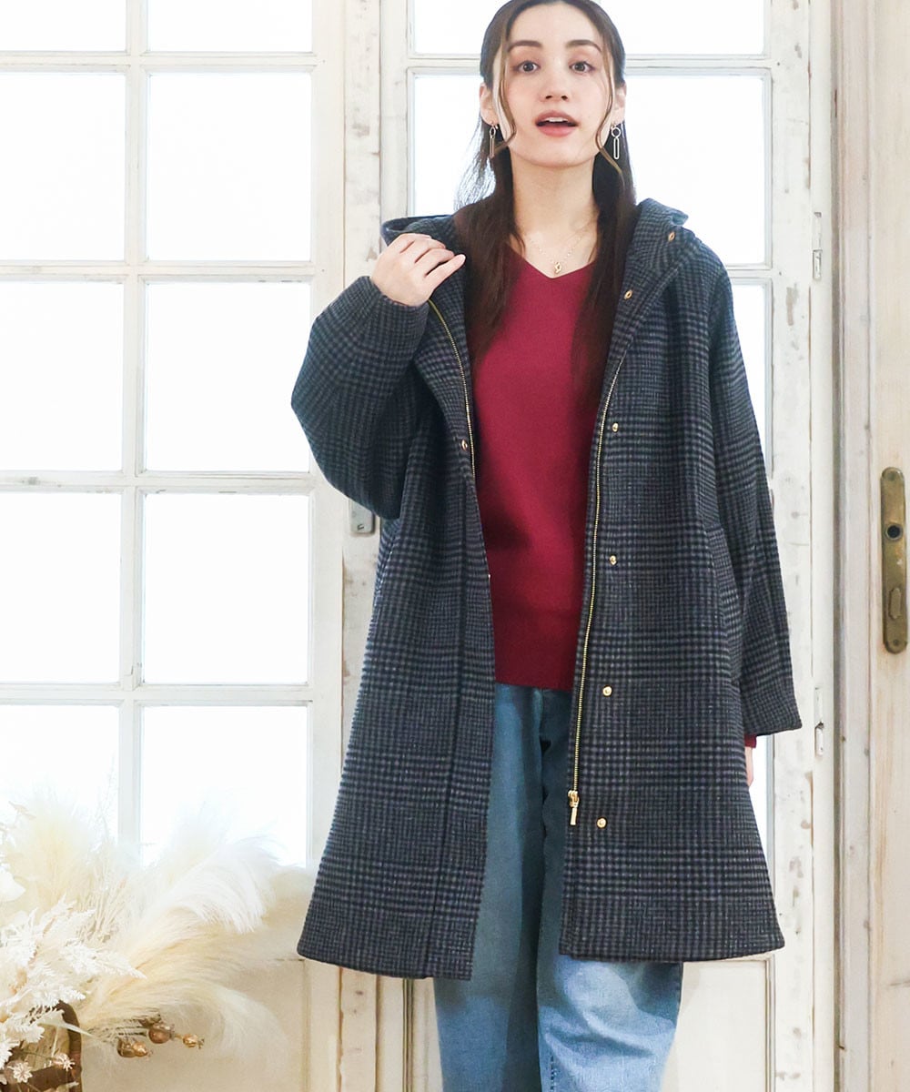気軽に着まわしやすいフード付きのウールコート。
