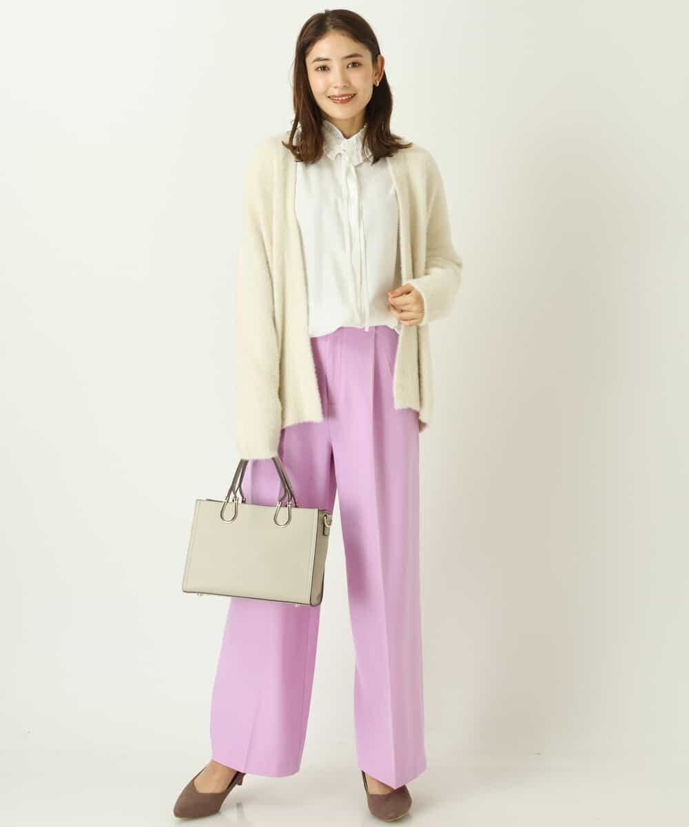 シーズン感高まるフェザーヤーンカーデを合わせた大人フェミニンな印象です。